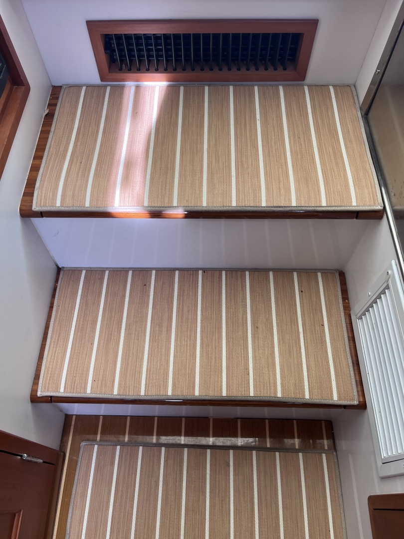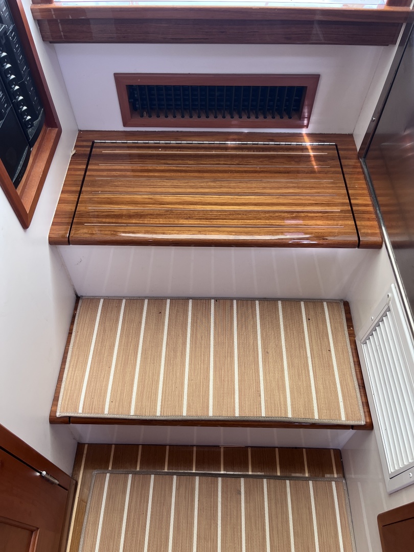 The boat’s air height is only 9 feet, which makes it appealing to anyone contemplating sliding under all the bridges on the ICW or the Great Loop. And the outboards, aside from their performance, mean you can take the boat into skinny water anywhere or tilt them up if you’ve run into lobster pots in the Northeast. Outboards also open up a lot of space in what used to be the engine room inside the boat; it’s also a whole lot easier, when the time comes, to replace an outboard than to replace an inboard.