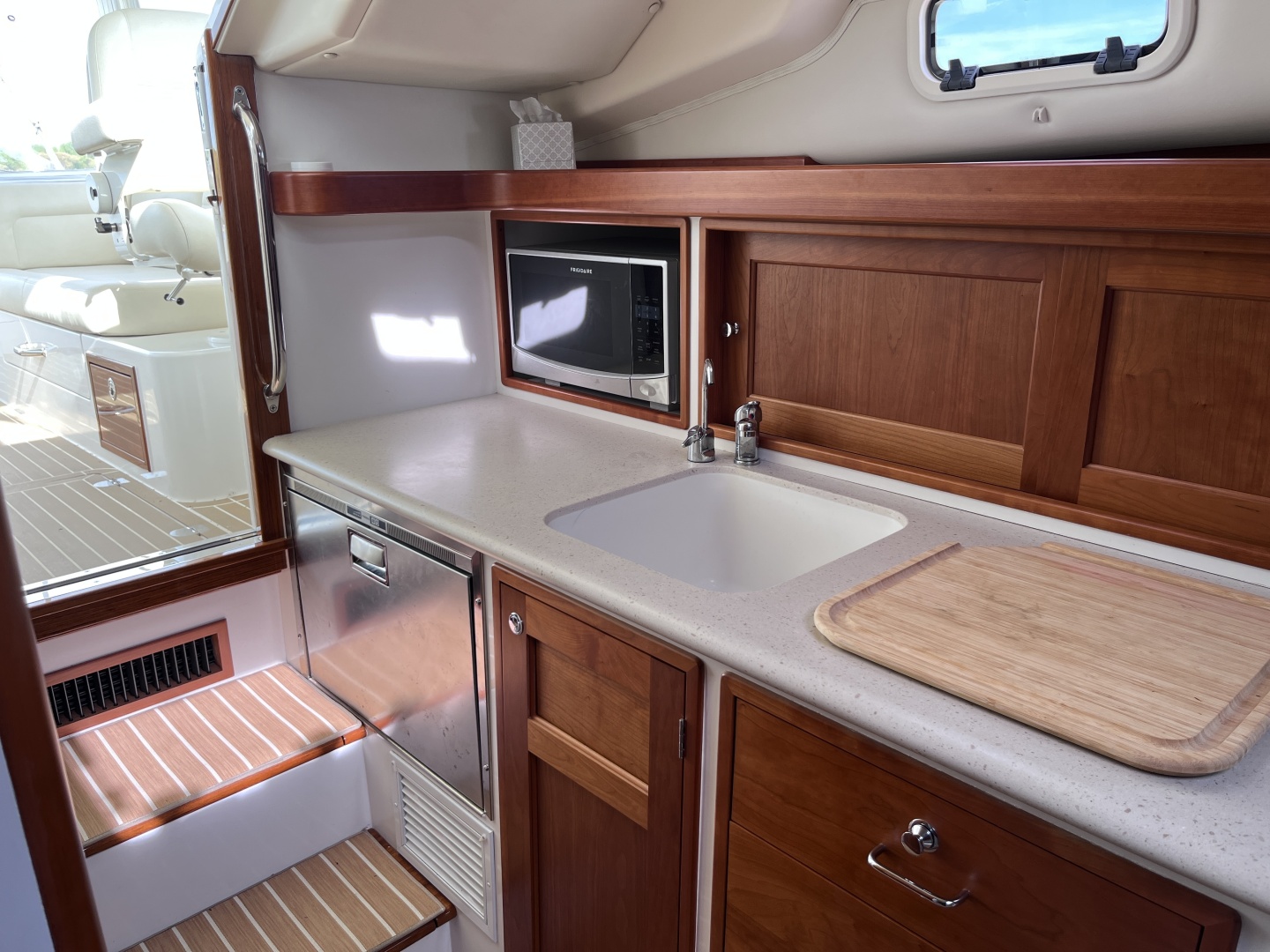 Below, the interior is in the classic Herreshoff style, with cherry-trimmed, off-white side panels and a teak-and-holly sole. The Ultraleather V-berth/lounge is forward, with an optional filler. Even with Zurn’s low profile, the cabin has standing headroom, with a few inches to spare for me and I’m more than 6’1” tall. And the V-berth was long enough for me to lie on it without having my feet hang off the end. The galley is to port, with a long Corian countertop, deep sink, drawers, a fridge (the icemaker is up on deck), a Princess single ceramic cooktop and a microwave. The head (with standing headroom and an opening port) is across to starboard.