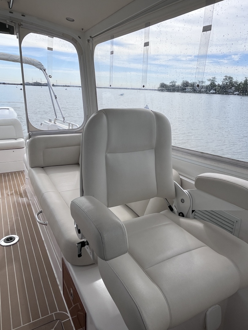 All the way forward are matching Stidd Admiral helm seats on swivel bases so they can be turned to face aft for socializing at the dock or at anchor. Visibility from the helm is simply excellent all around, even when the boat comes up on plane, when there’s almost no bow rise. The two large front windows open fully for ventilation, the windows on either side slide back, and two overhead hatches also open. Even with the boat all buttoned up for the performance and sound tests, Johnstone left the overhead hatches open and fresh air circulated in and then went out aft via an inch or so of open space below the rolled-down Strataglass door aft. The three of us were comfortable on a hot day, and we could talk easily until the very top of the speed curve; the boat registered only 77 dB(A) at the helm at 23 knots in a two-foot chop.