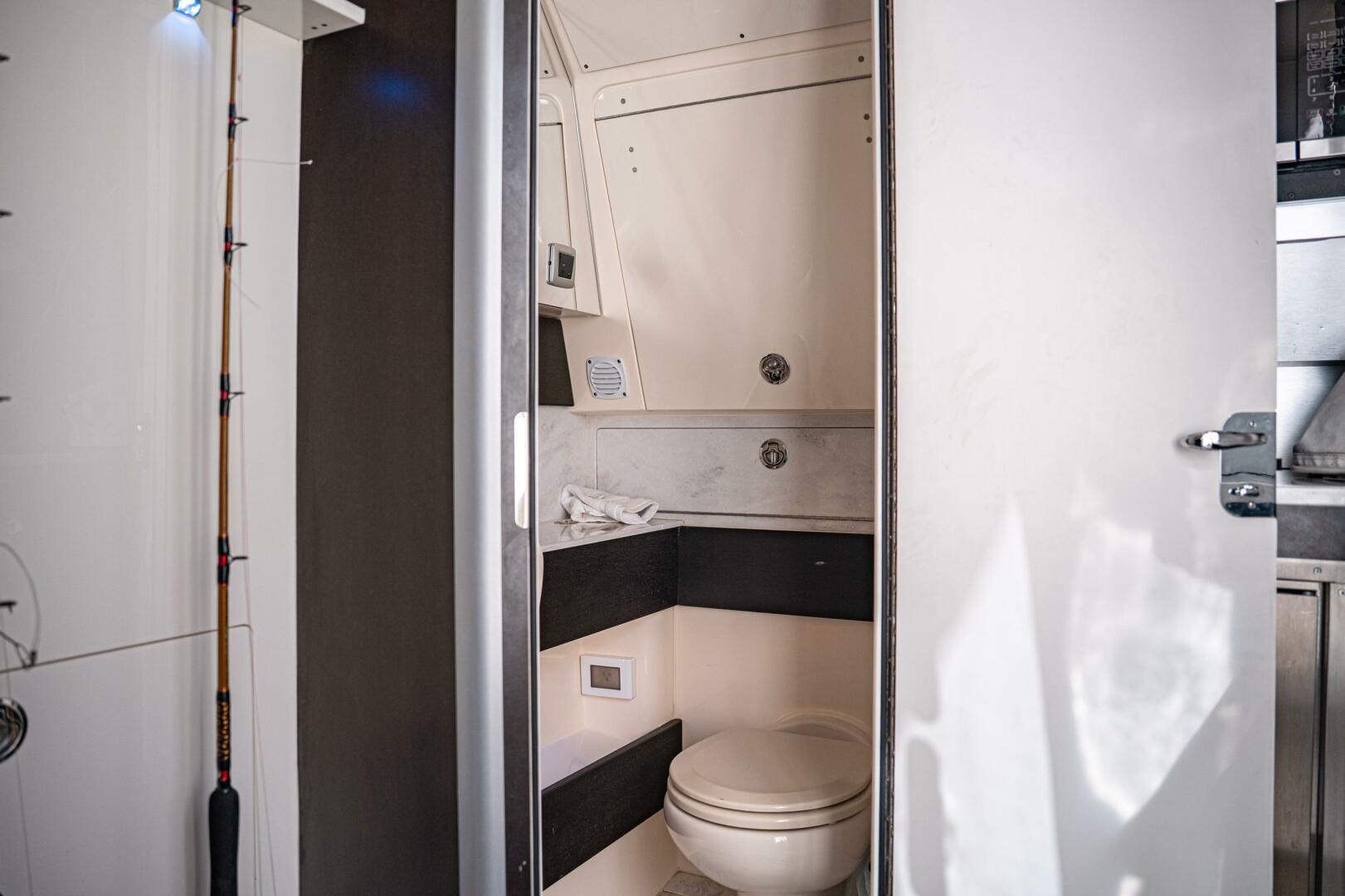 - Fully enclosed private head with shower and vanity