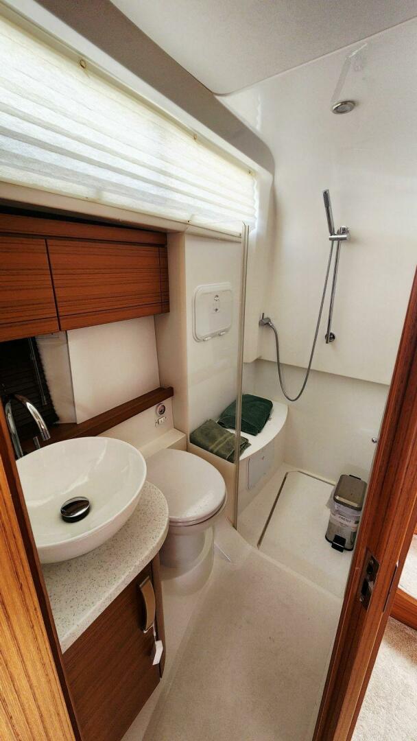 Below, the accommodations are designed for flexibility. The guest cabin to port features twin berths that can combine into a double, along with locker storage and opening ports. The head is smartly appointed with an electric toilet, vanity, and a separate shower, with dual access from both the companionway and the master stateroom. In the master, the berth converts from a V-berth to a full island queen, surrounded by ample storage and bathed in natural light from windows, ports, and hatches.