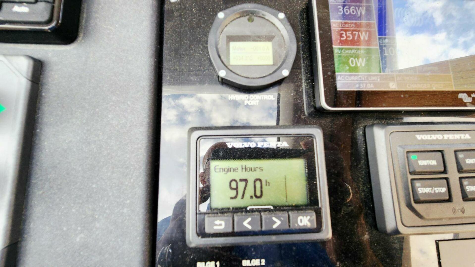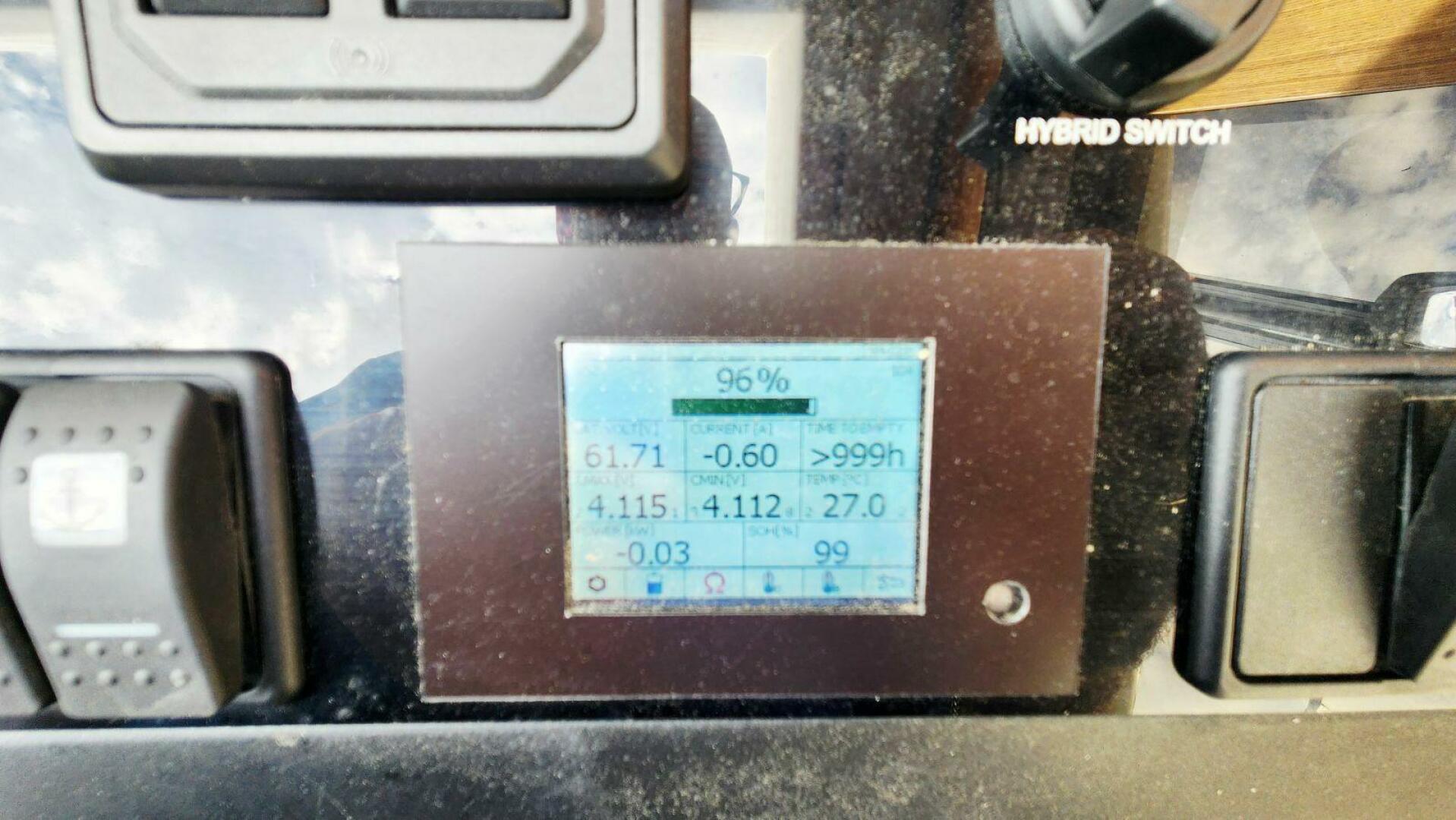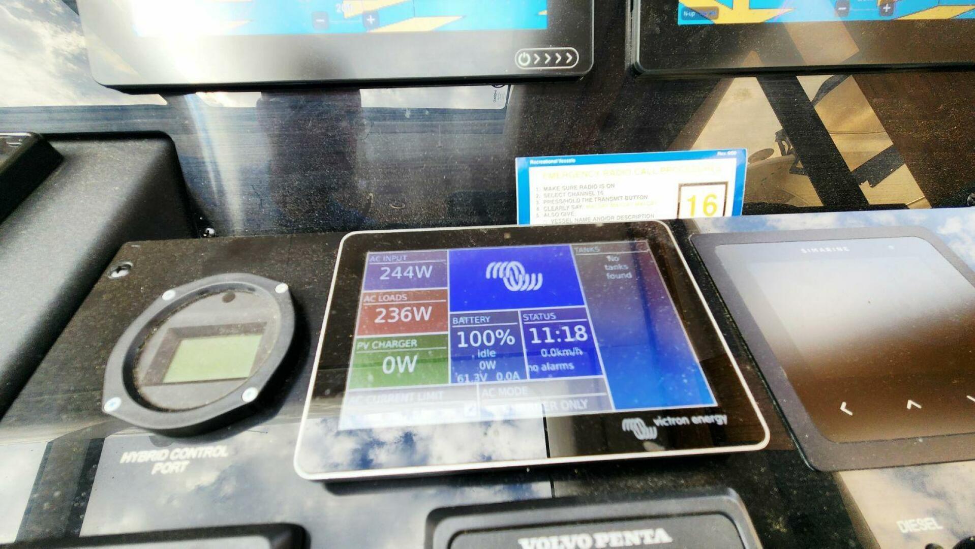 A Victron energy management display is also integrated at the helm, giving real-time oversight of batteries, charging, and power usage—so you know exactly how the hybrid system and solar array are performing at a glance.
