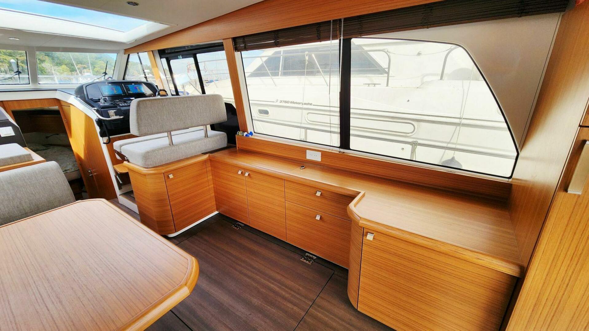 Sliding glass doors open into a salon designed to feel bright and open. Expansive windows wrap the space, while warm veneers, dark flooring, and Rugana upholstery create a refined yet comfortable atmosphere. The portside galley features Kerrock counters, induction cooktop, microwave, and abundant storage, with a full refrigerator and freezer opposite. A large opening aft window with a folding countertop turns meal prep into part of the cockpit conversation, making entertaining seamless. Just forward, the convertible dinette doubles as both dining and coffee table and can drop down to form an additional berth.