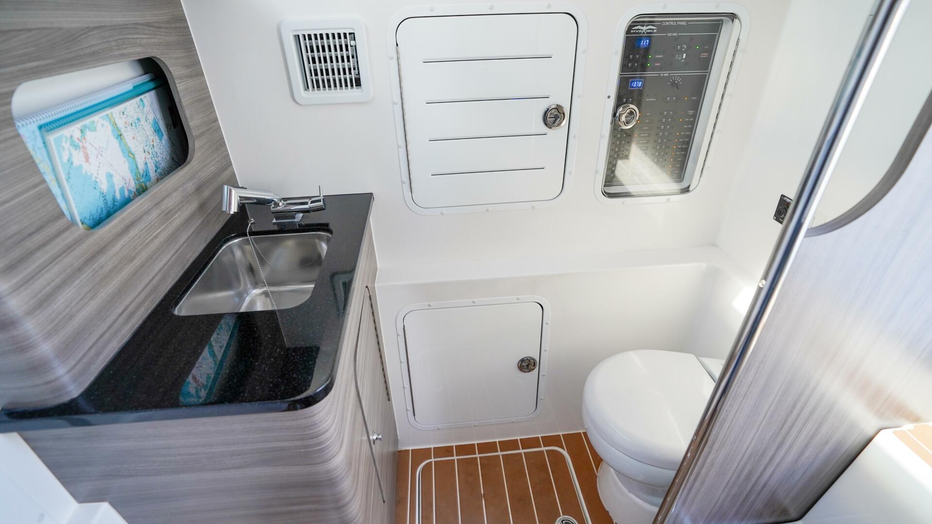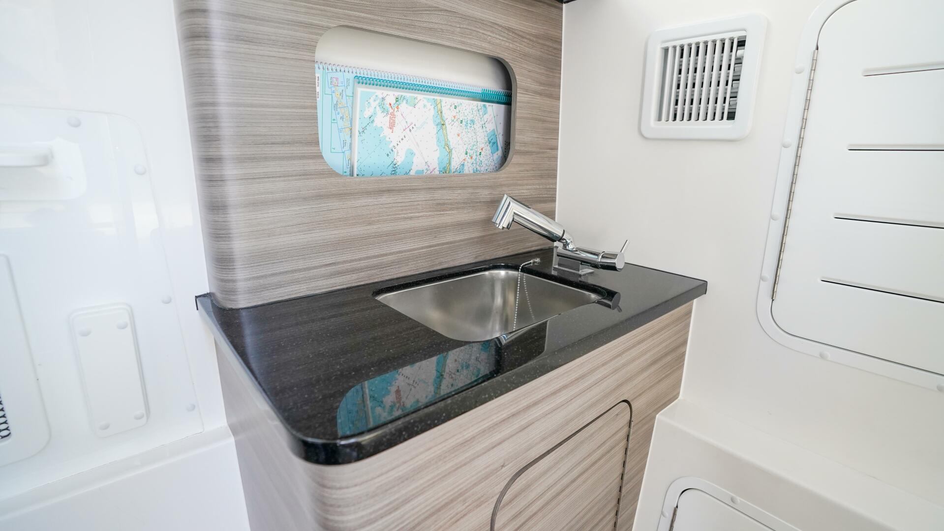 Moving forward to the console interior, the boat reveals a surprisingly spacious and luxurious retreat. The extended console features a deluxe electric head, vanity with sink, ample storage, and plush diamond-stitched cushions, making it ideal for extended day trips or family cruising. The upgraded battery system, charger with galvanic isolator, and engine flushing system are all neatly integrated for reliability and ease of ownership.