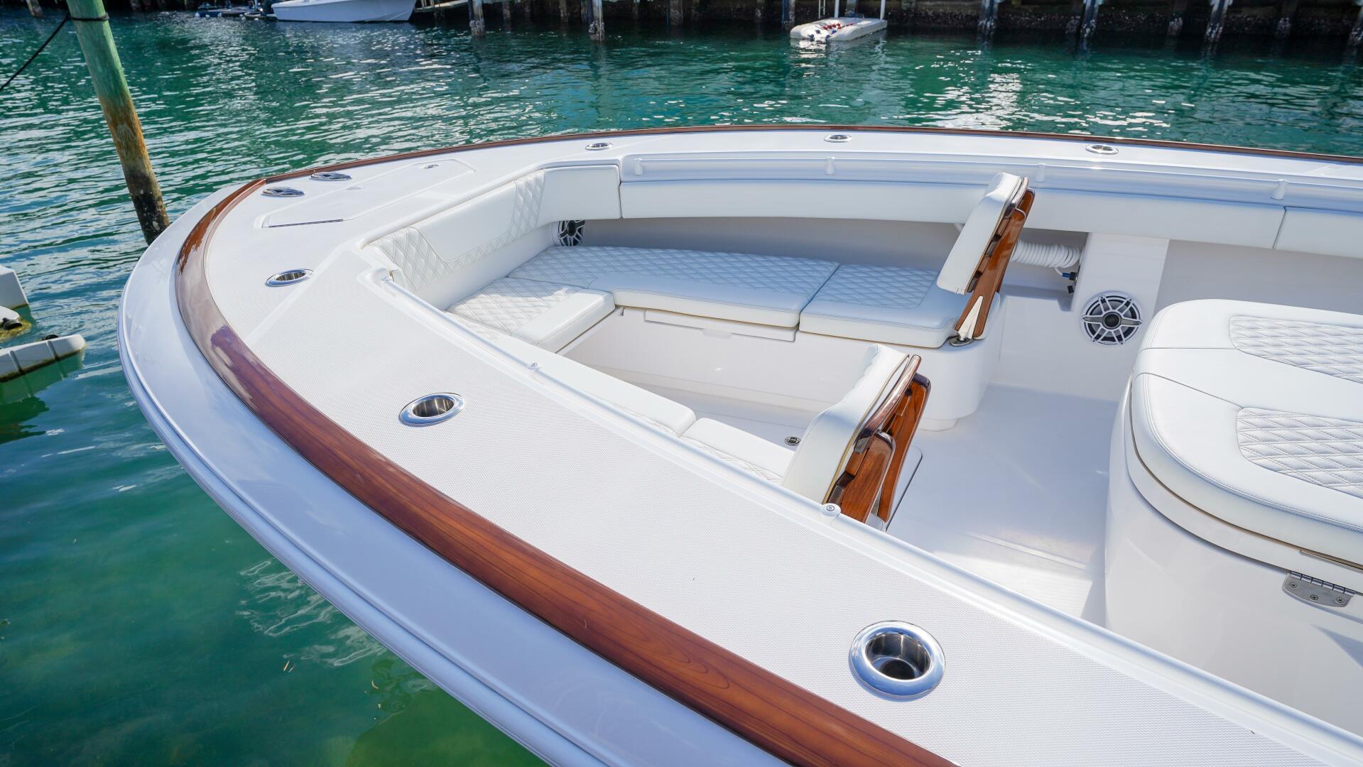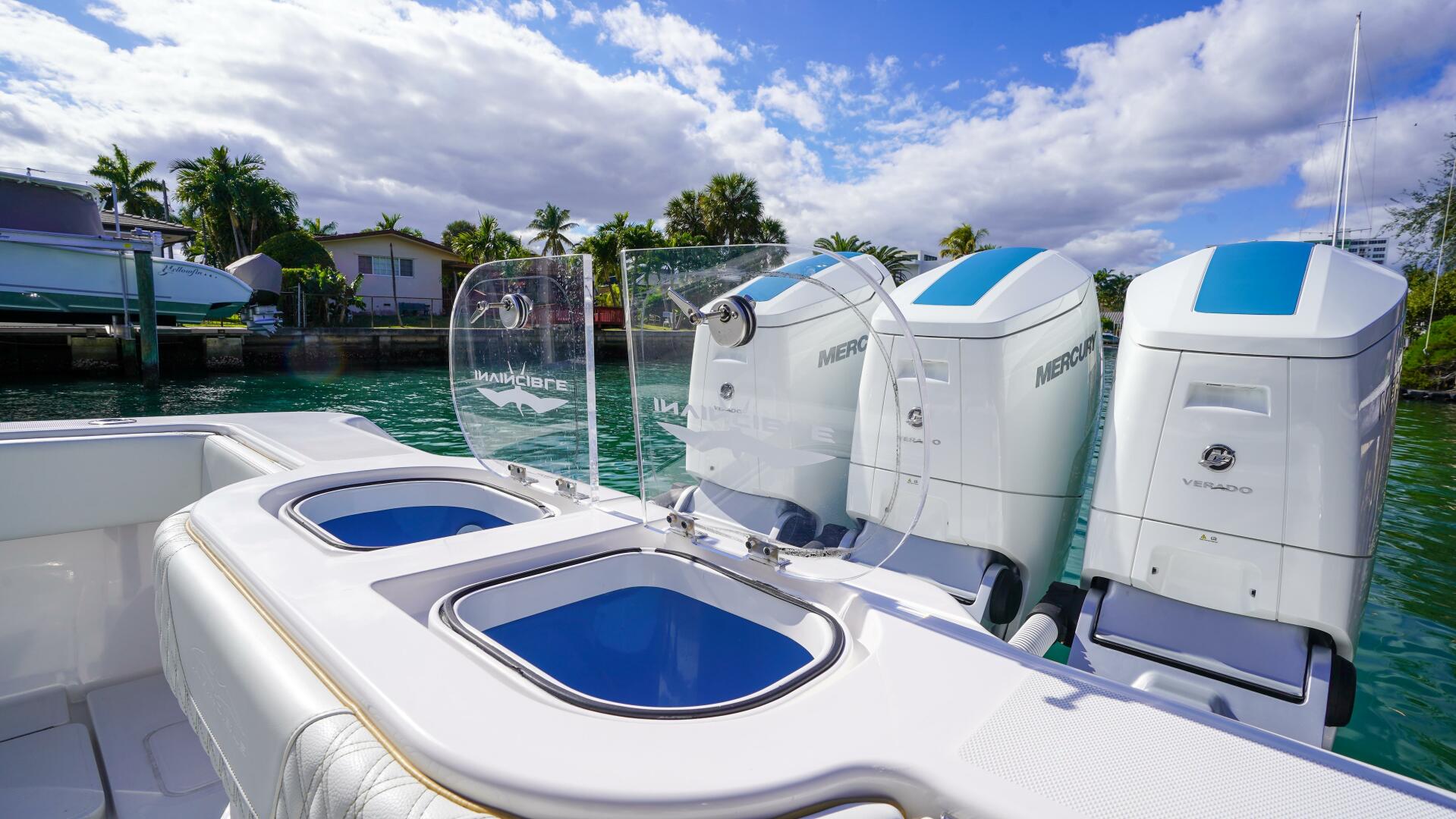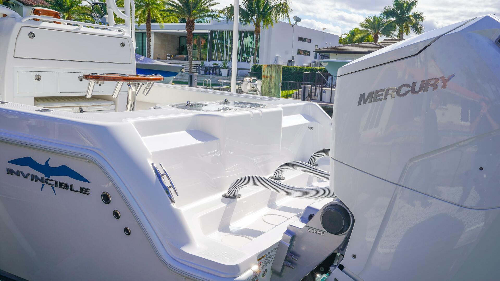 Starting at the stern, the 2024 Invincible 43 Open immediately showcases its offshore pedigree with a wide, uncluttered cockpit designed for serious bluewater fishing. Powered by triple Mercury 600 Verado outboards in white, the transom area is reinforced for heavy offshore use and features an etched transom livewell lid, dual illuminated livewells, heavy-duty swivel rod holders, electric reel outlets, and a Best Marine seachest with four pumps supporting all livewell and raw-water systems. Teaser reel integration, extensive gunwale rod storage, faux teak toe rails, and powder-coated bow rails reinforce the boat’s tournament-ready design while maintaining a refined, high-end aesthetic.
