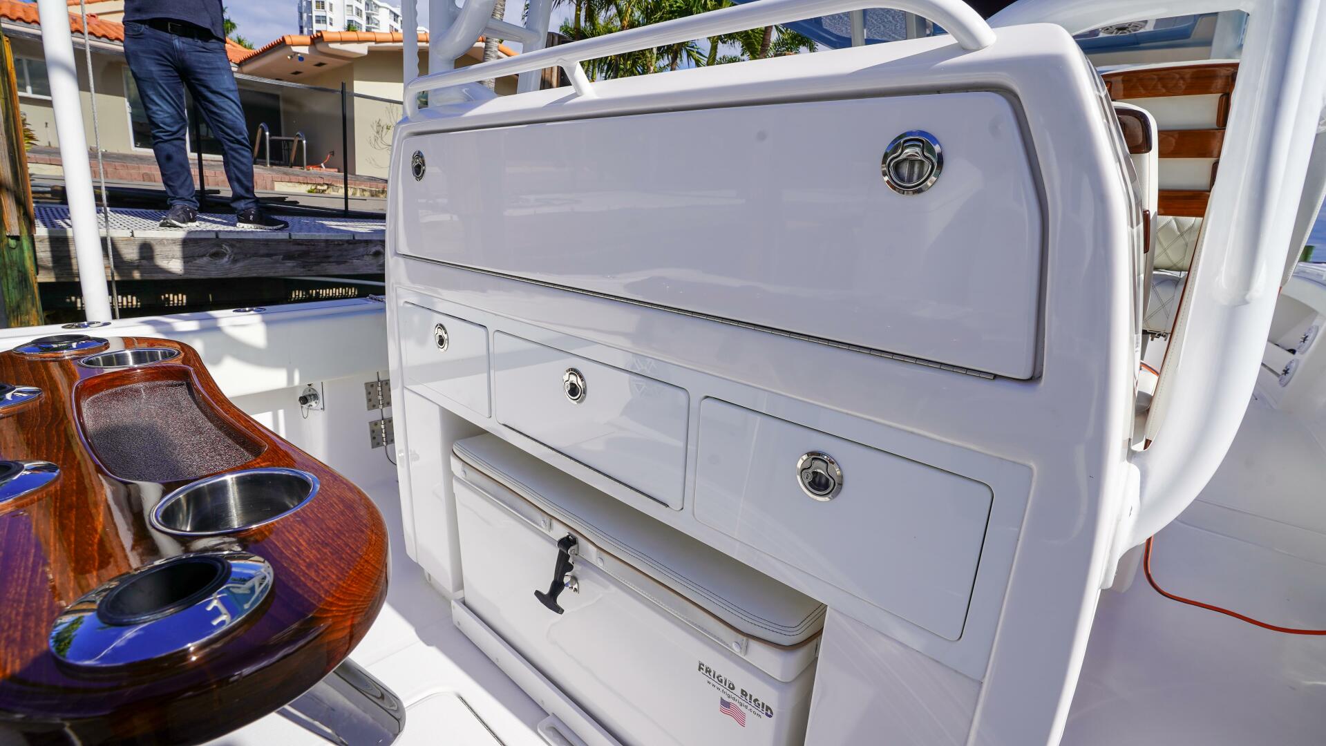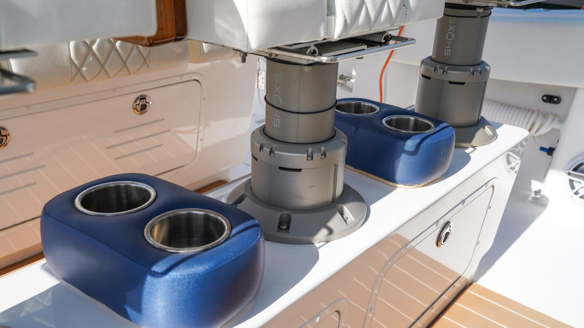 Moving forward into the cockpit and aft seating area, the layout balances hardcore functionality with comfort. Rear fold-out jump seats and Release Marine U-shaped backrests provide flexible seating for guests without sacrificing fishability. Stainless steel cupholders are integrated throughout, and the hull-side dive door with ladder allows easy water access for diving, swimming, or boarding from the dock. Underfoot, the expansive deck space allows anglers to move freely during multiple hookups, while premium coaming bolsters add comfort during long days offshore.