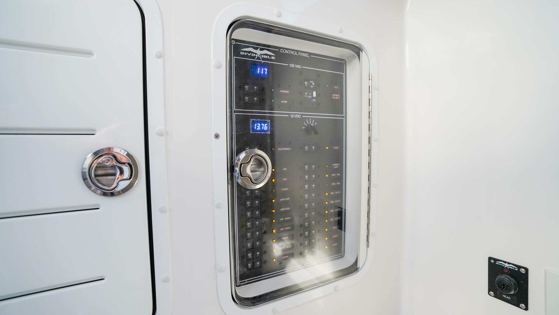 Above the helm, the custom hardtop and tower configuration sets this Invincible 43 apart. The extended pilothouse-style hardtop with rear support includes LED spreader lights, kingfish rod holders, rocket launcher reinforcement, Gem Blue outrigger bases with 22-foot internal white poles, and multiple rod storage options. The second station is fully equipped with its own Garmin display, VHF command mic, windlass and bow thruster controls, offering excellent visibility when running offshore, spotting fish, or docking.