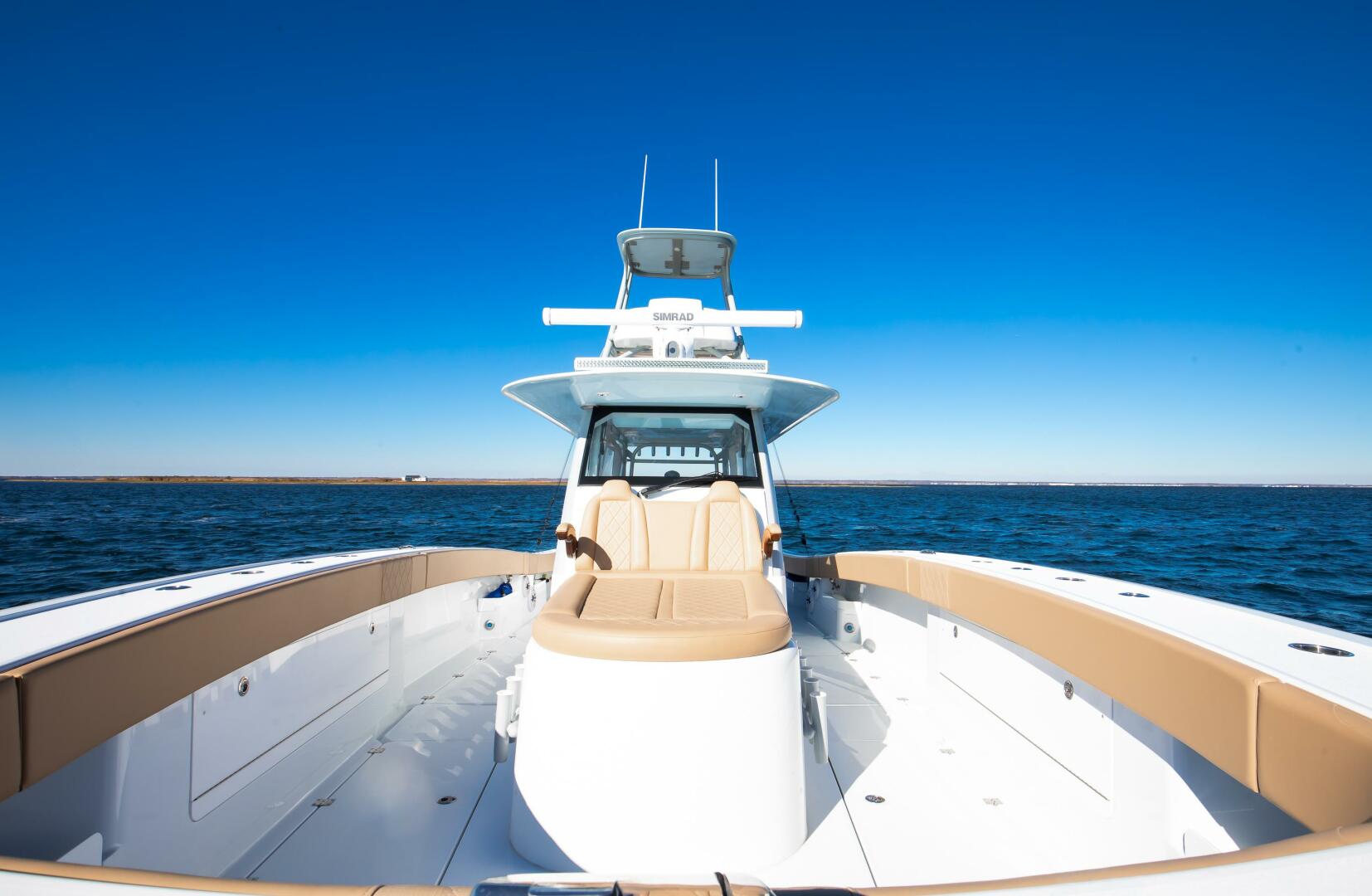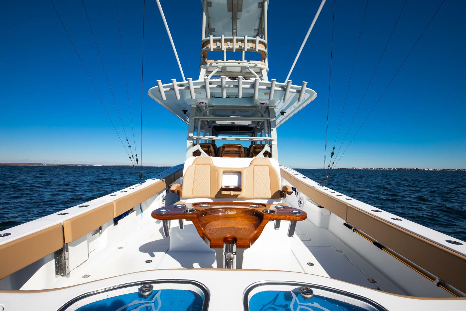 - Dual-row helm seating with teak-accented Release Marine bucket chairs on Shox pedestals