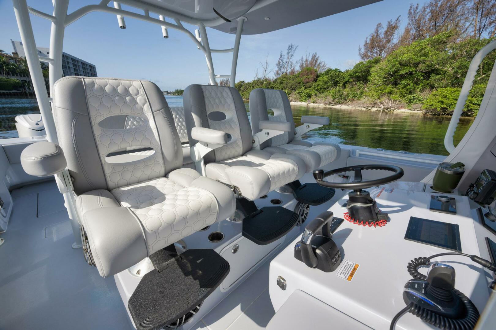 - Stadium Seating, 44 Includes (front) triple pedestal mounted lebroc seats with footrests on fiberglass module, (rear) m-series leaning post bench seat, extended hard top and electric cooler slide