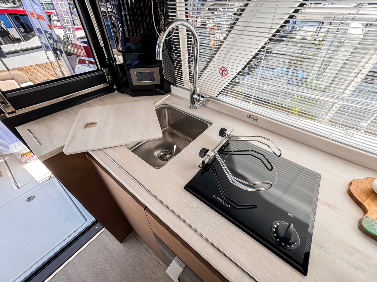 - Electric furling aft cockpit sun protection (2 carbon poles / sunworker charcoal / extra vertical sun protection aft)