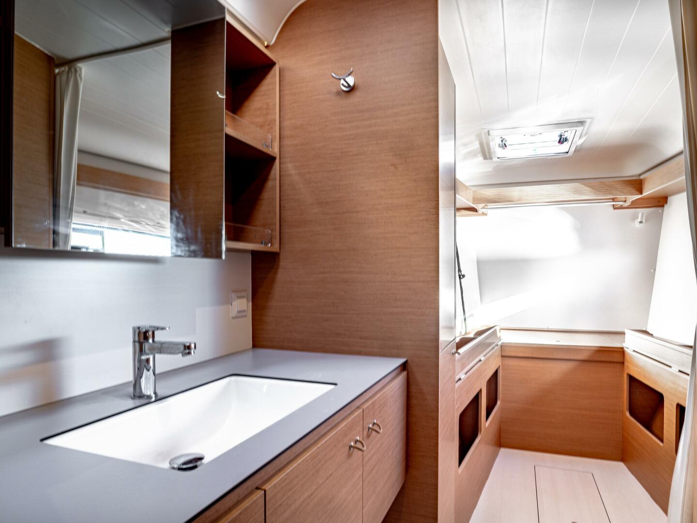 Warm Ash timber finishes, excellent ventilation, and a flexible layout provide a bright and comfortable sleeping area suitable for extended cruising. This three-cabin design can be converted to four when needed via two additional berths in the dressing area. Three thoughtfully designed heads offer walk-in showers and electric toilets.