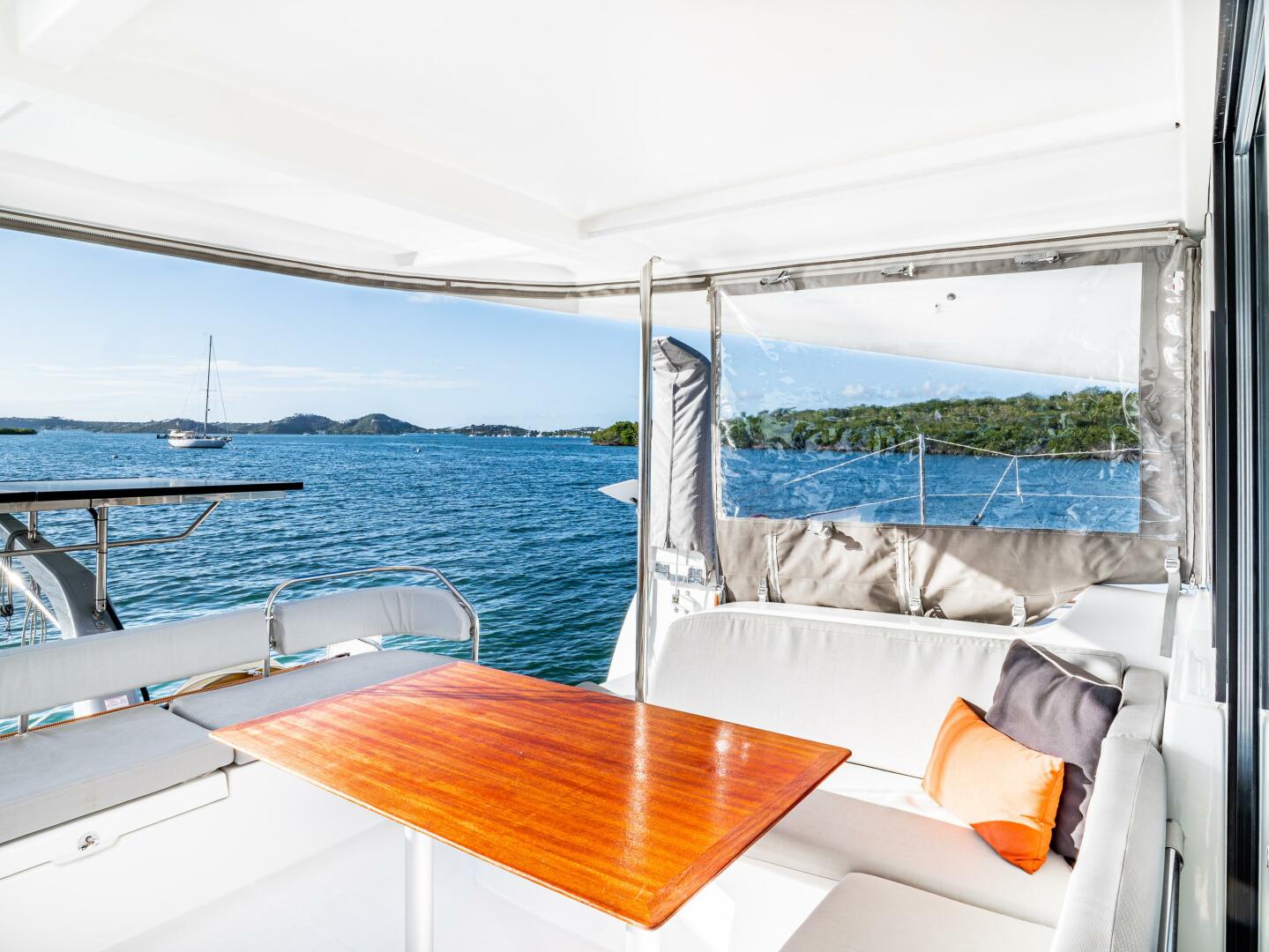 Spacious and bright central living area with panoramic visibility, ample seating and seamless connection to the cockpit.