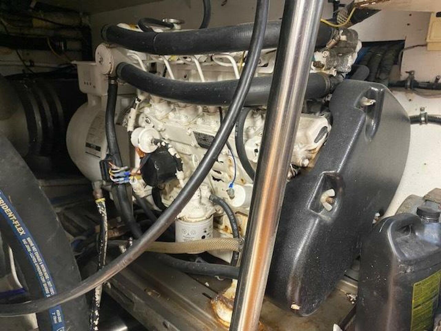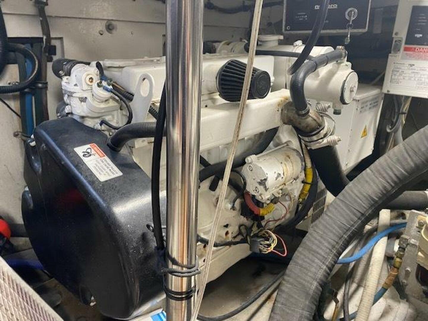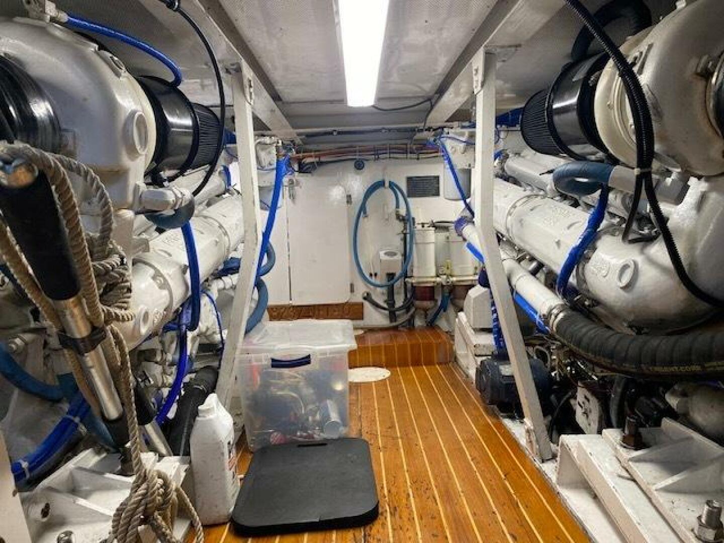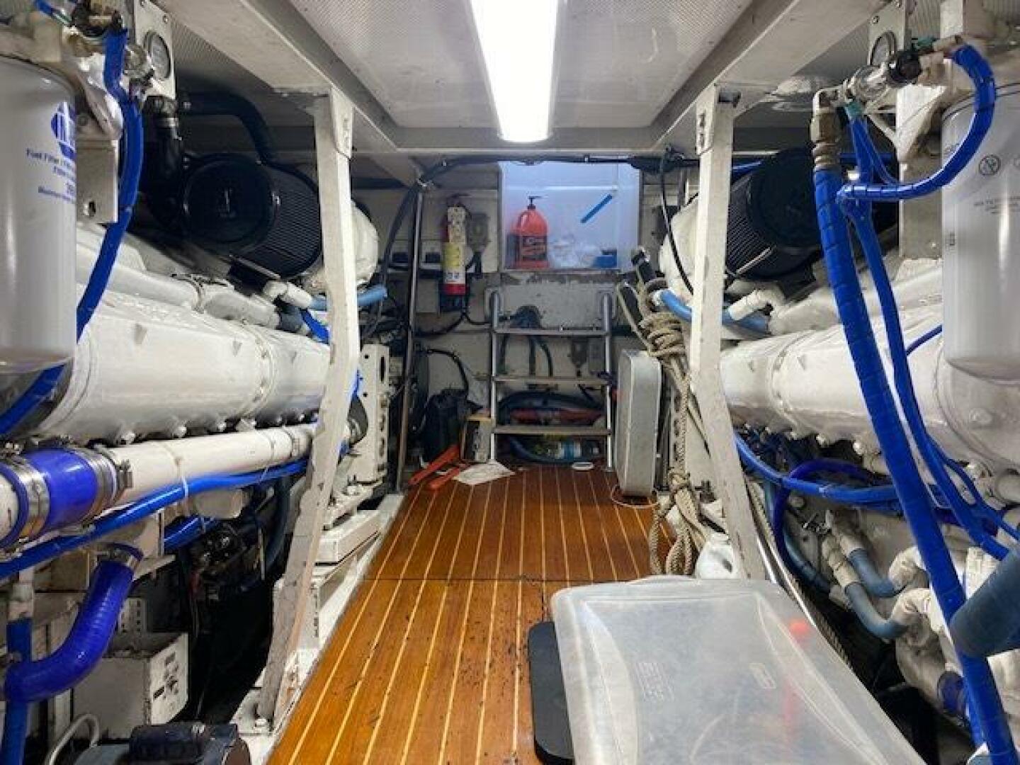 Engine room is large and spacious, with room to access the outboard sides easily, Also a dedicated pump room forward that houses AC units and other plumbing manifolds and pumps