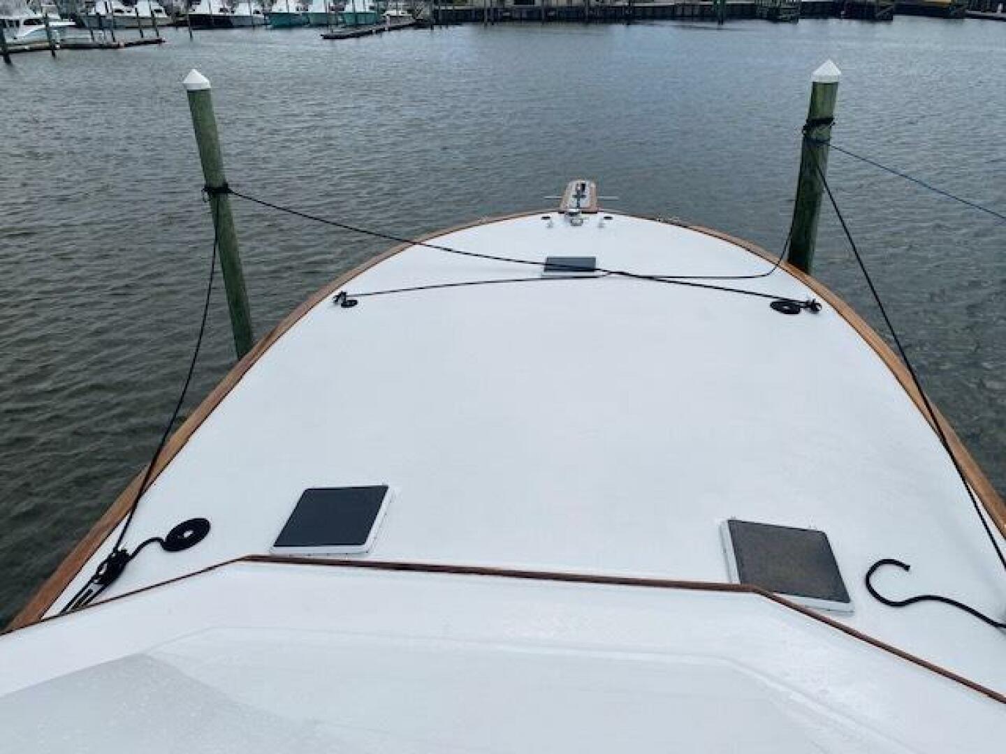 The builder, Carson “Buddy” Davis, was a North Carolina fisherman from Wanchese. As a teenager, he started work as a mate, fishing upper Pamlico Sound inside Oregon Inlet. A captain at age 19, he, like many other local fishermen, took to building boats in the off-season. In 1980, at 31, he began building full time. An innovator from the beginning, Davis paired diagonal mahogany plywood with fiberglass for his hulls and eventually went to all-fiberglass construction.