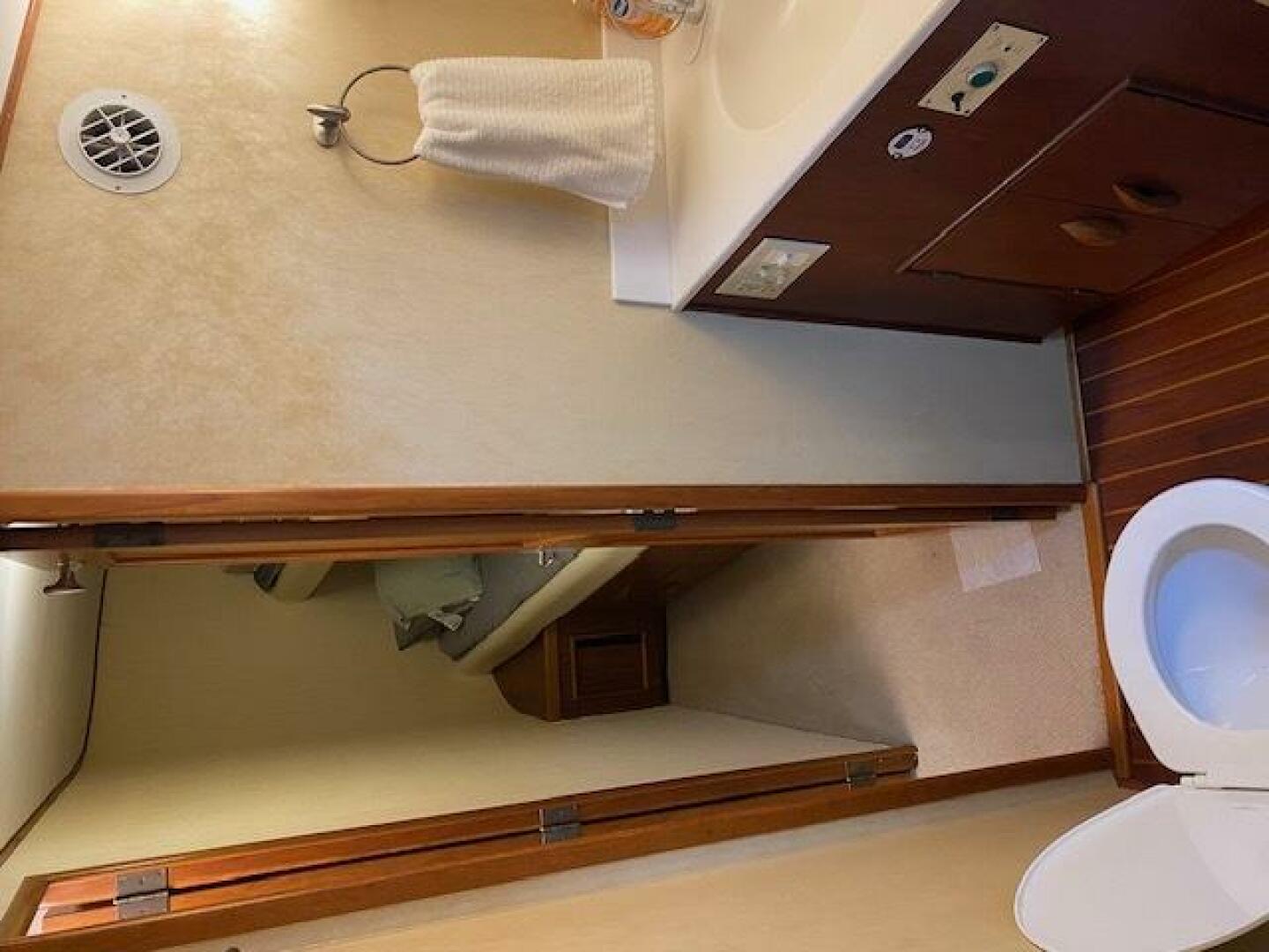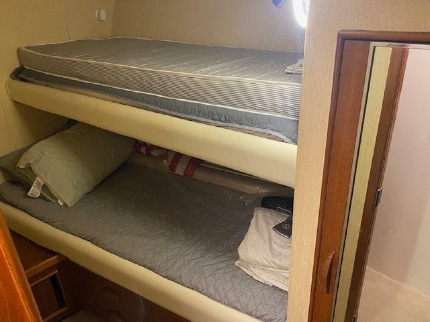 Located down the companionway forward and to starboard, these stacked bunks are roomy and comfortable, are behind a lockable door and share a full head and shower with the Crew's Quarters