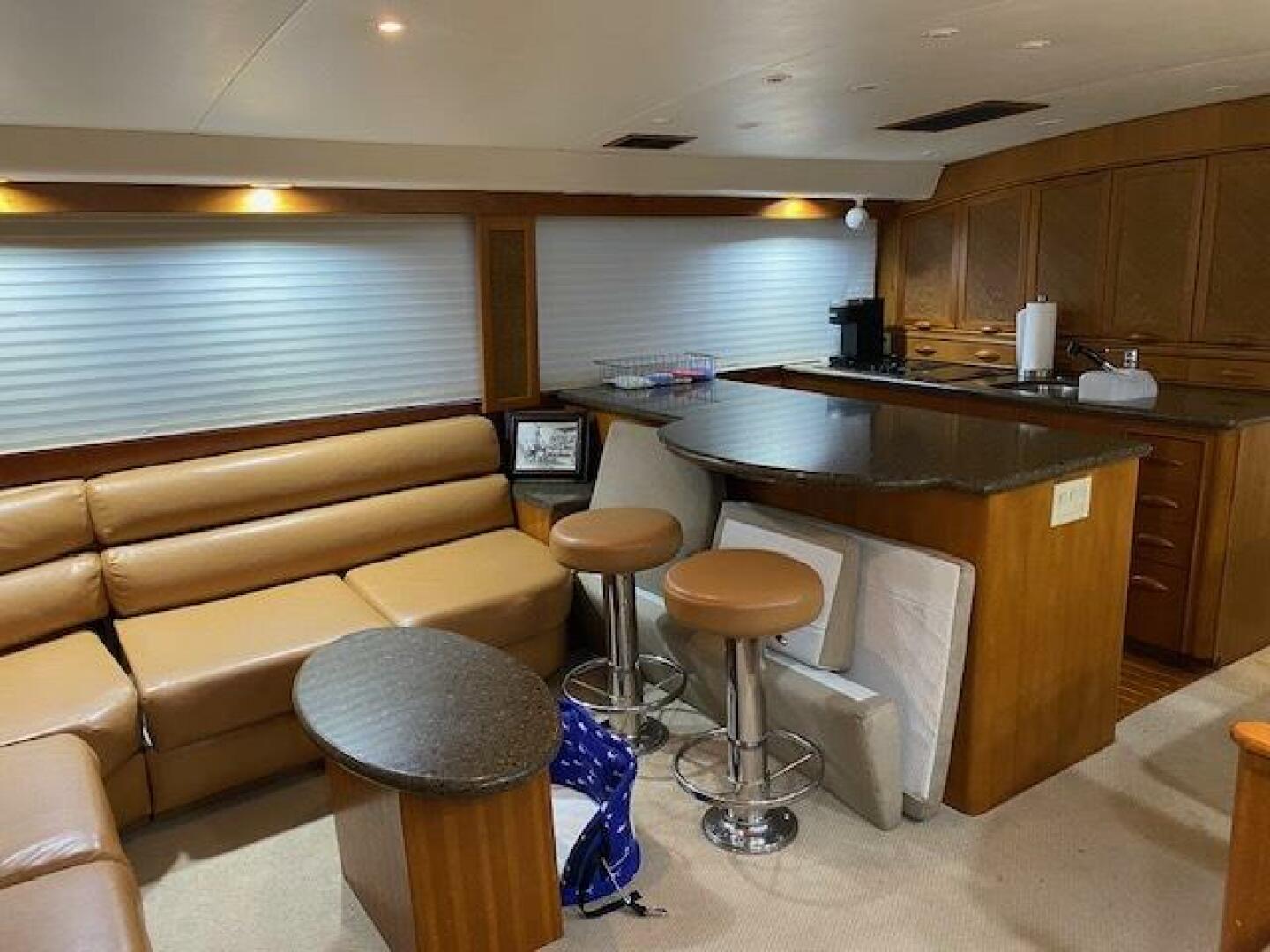 Large L-shaped custom Van Brunt hinged top couch to port. Custom upholstery with ultra leather material and easy access storage within oversized Silestone bar top with barstools and extended round table portion to port