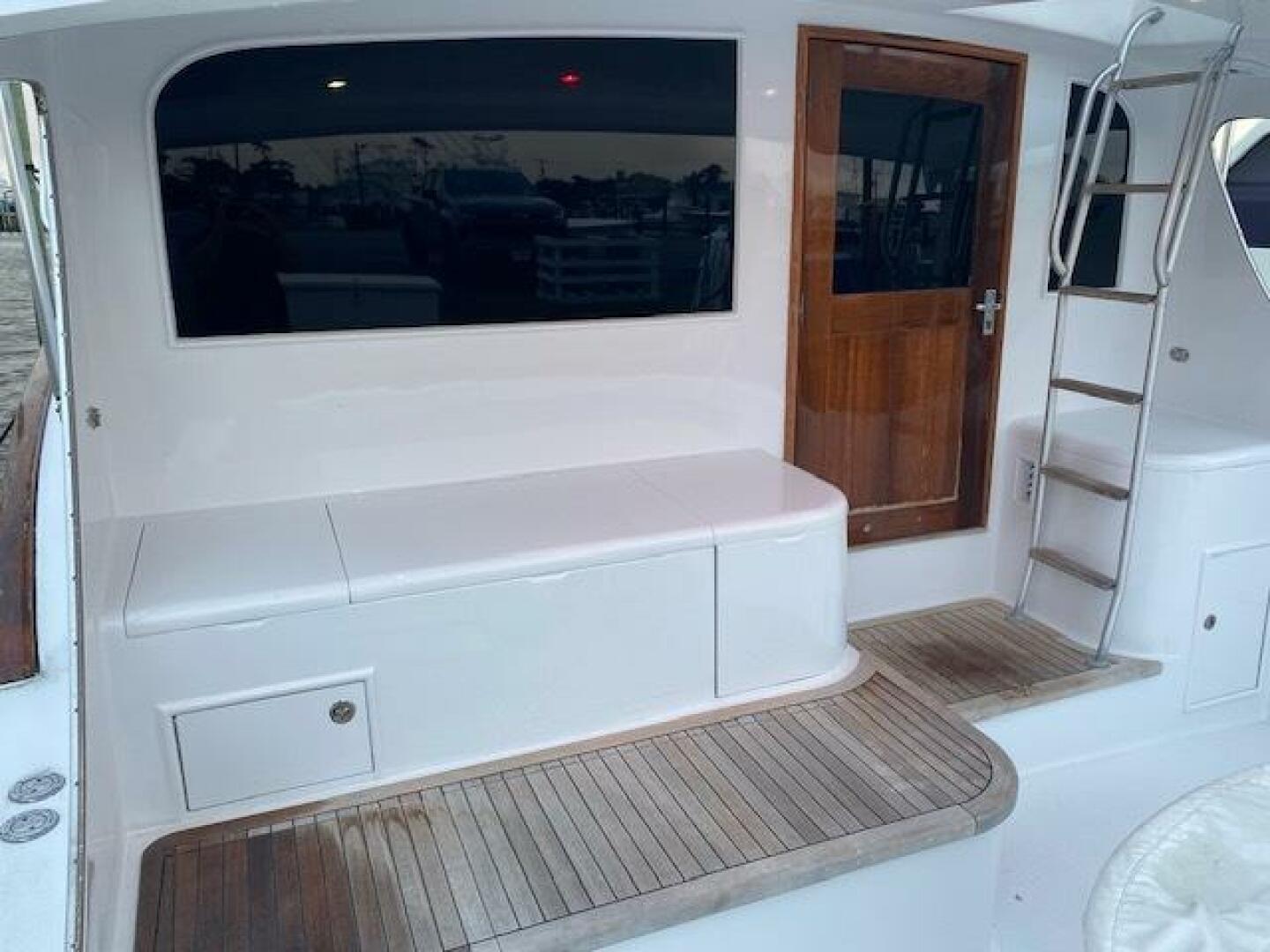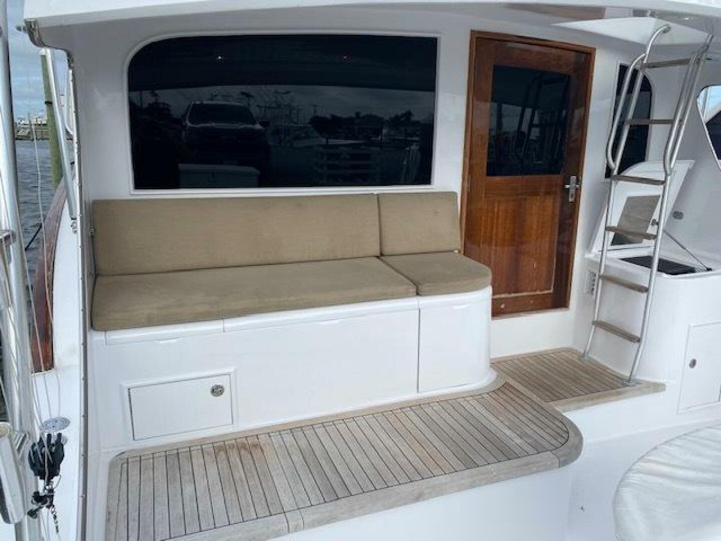 Large teak covered mezzanine with cushioned seating, ice dump, refrigerated box and plenty of storage bins