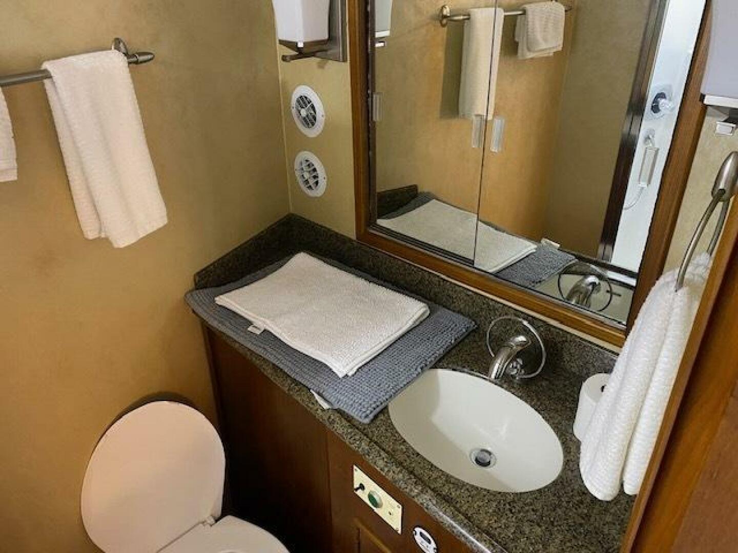 Shared head has shower, Galley Maid Toilet, Sink and Vanity, Mirrored Cabinet and Storage