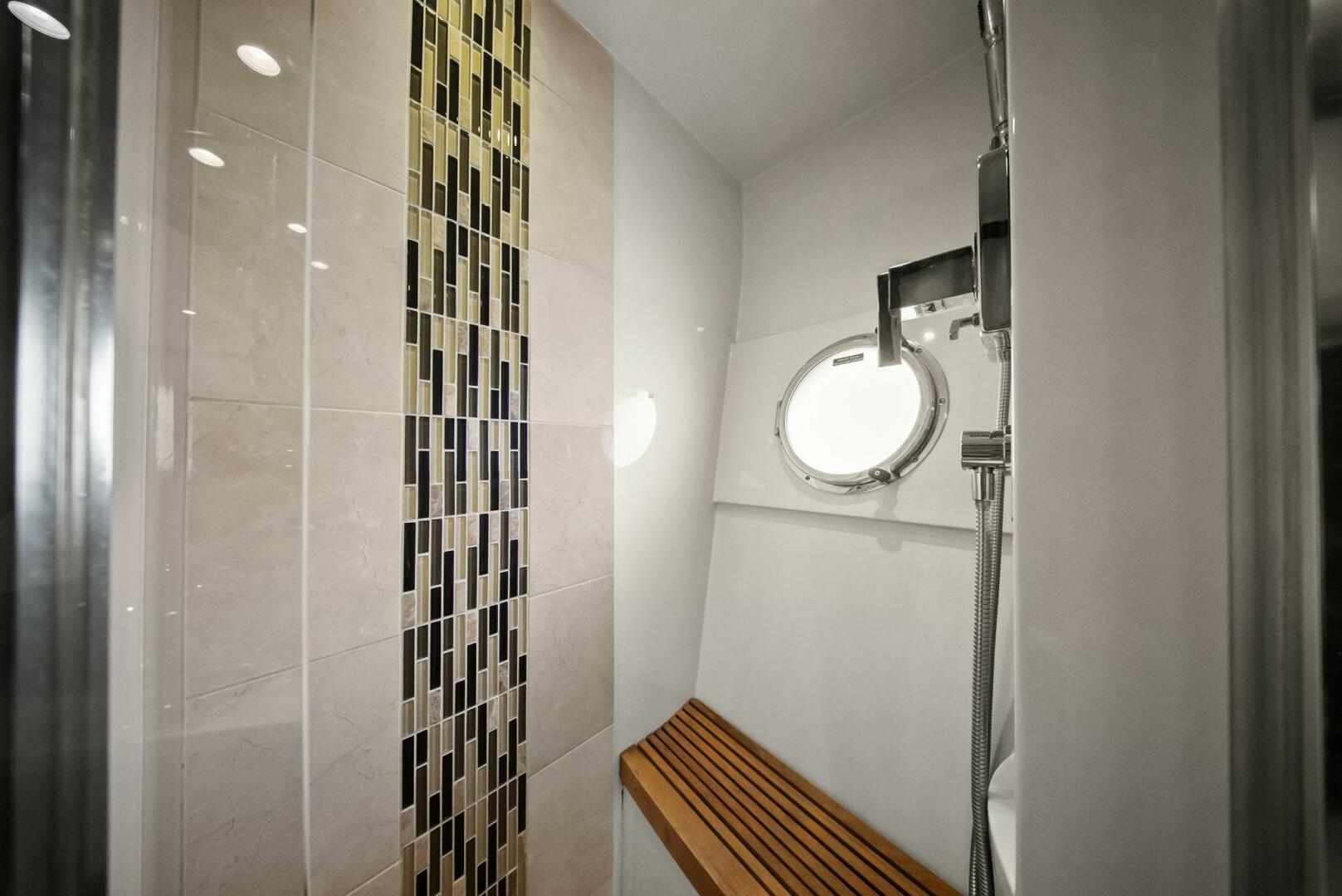 - Folding teak seat for the master stateroom shower together with teak shower grate