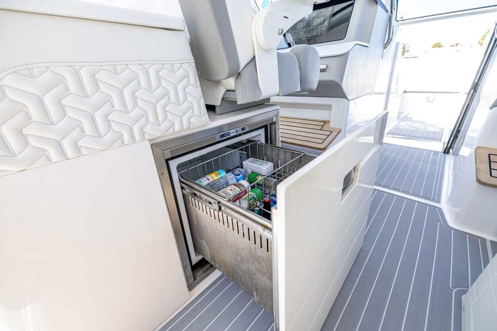 - Port Side Day Galley Featuring Corian Countertops, Deep Sink, Ice Bin, Kenyon Electric Grill, Pull Out Waste Basket and Yeti Cooler on Sliding Shelf