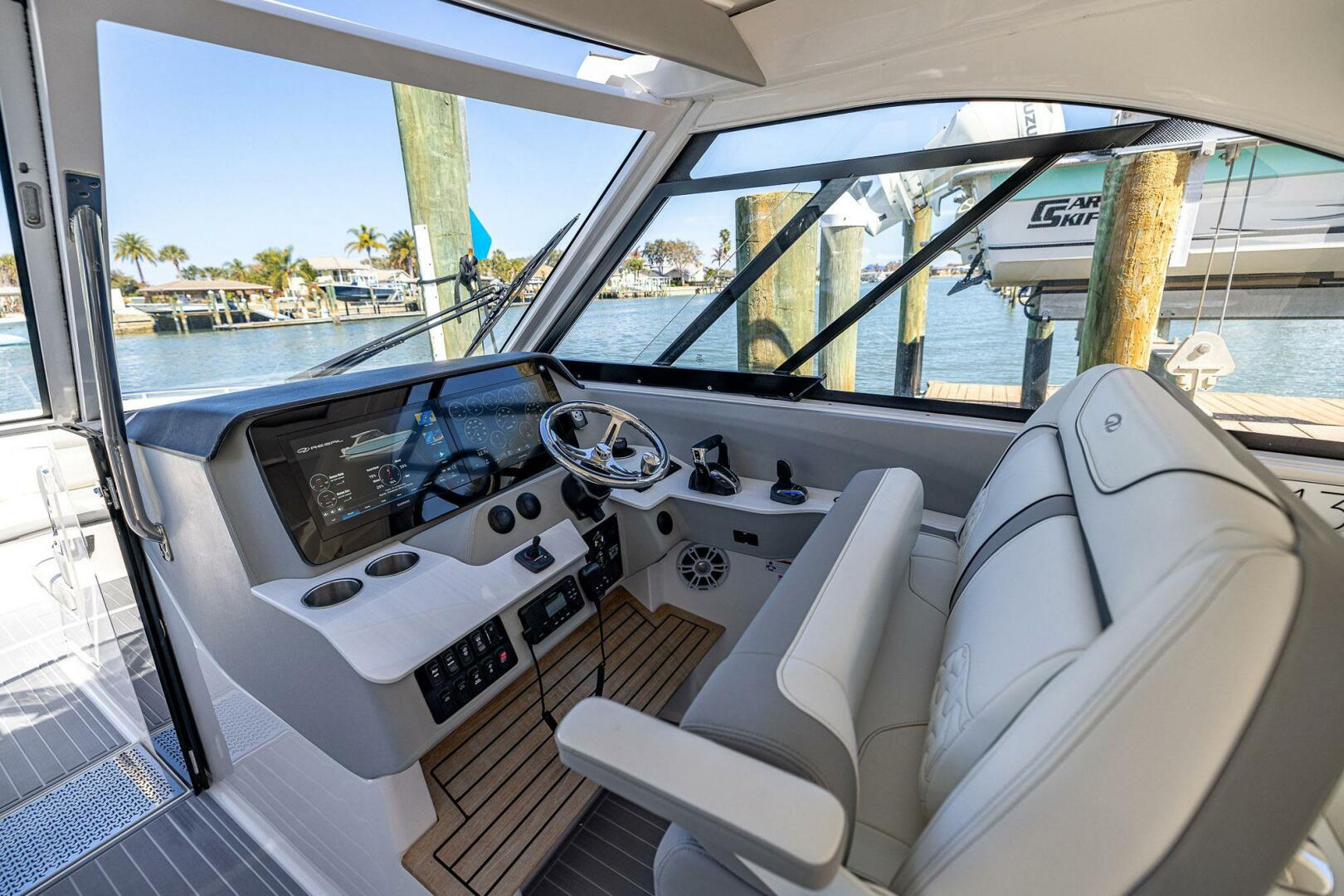 - Dual Console Configuration with 2-Person Port Side Companion Seating, Fold Down Thigh Bolsters, Folding Armrests, Glove Box, Teak Accented Footrest and Dedicated Garmin 16" Display