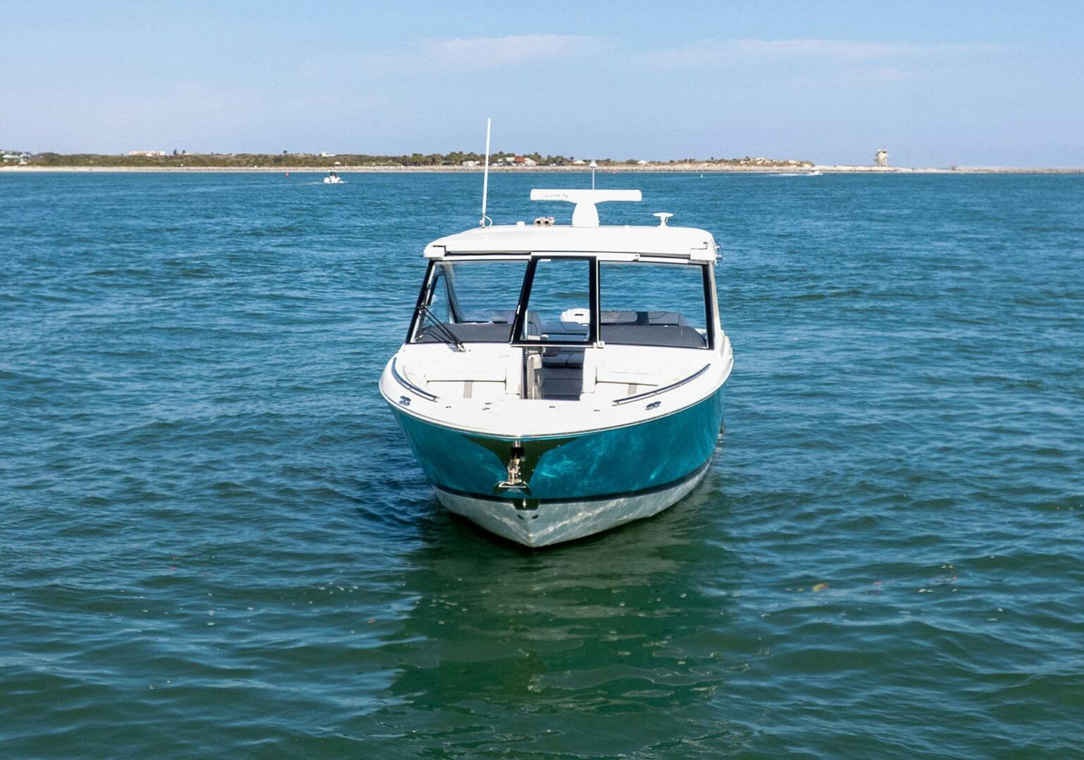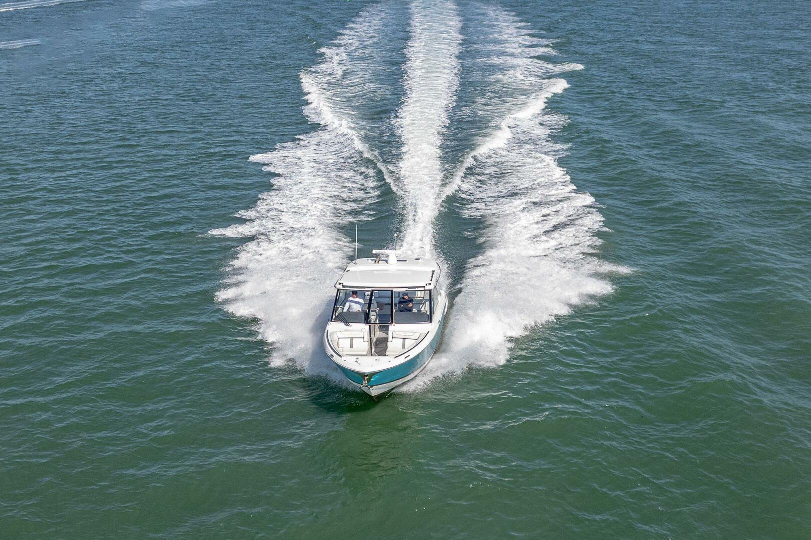 - Bi-Fold Acrylic Door and Hinged Windshield Allow Access to Bow Seating