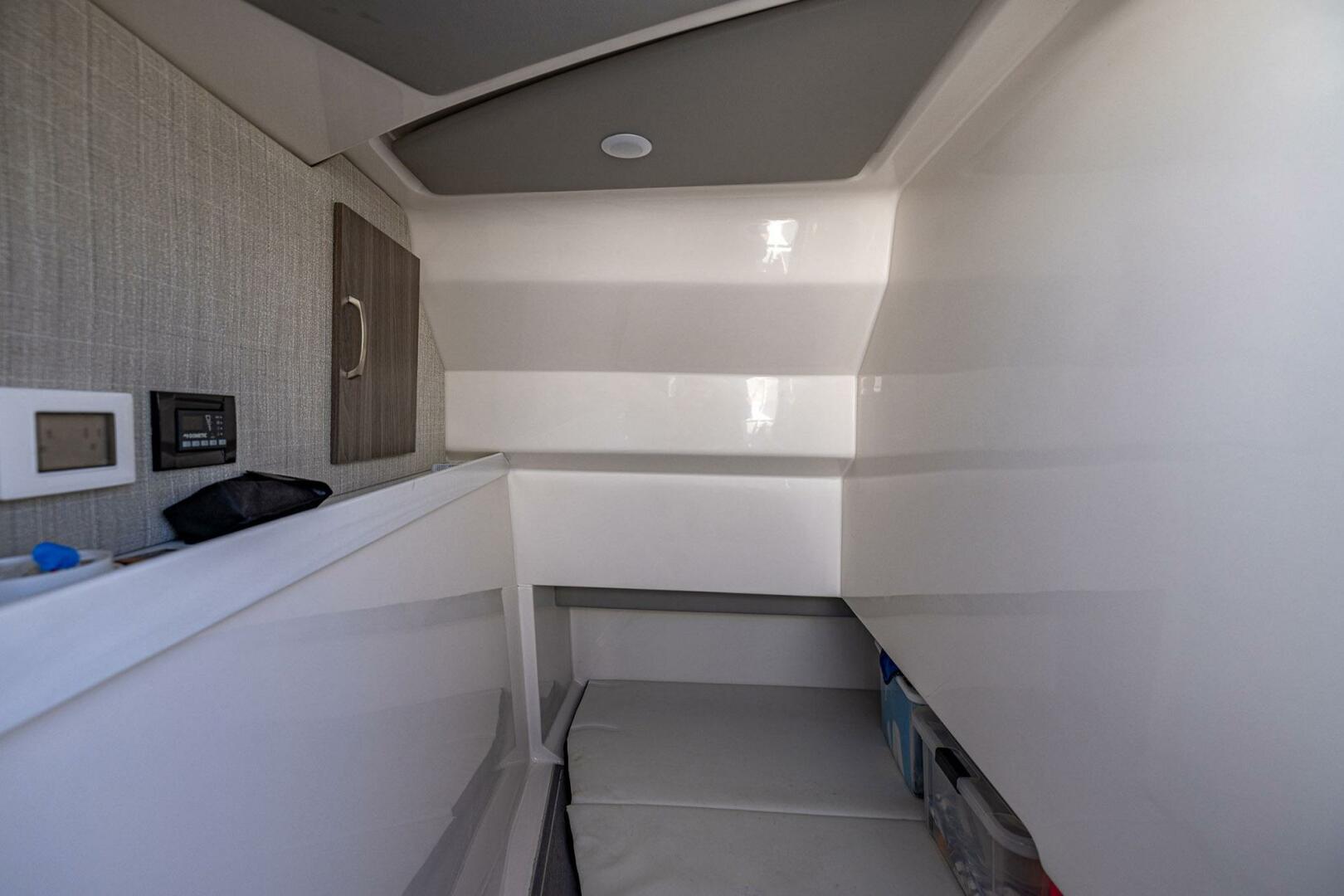 - Hinged Starboard Bow Seat in Front of Helm Provides Access to Air Conditioned Quarter Berth with Upholstered Cushion