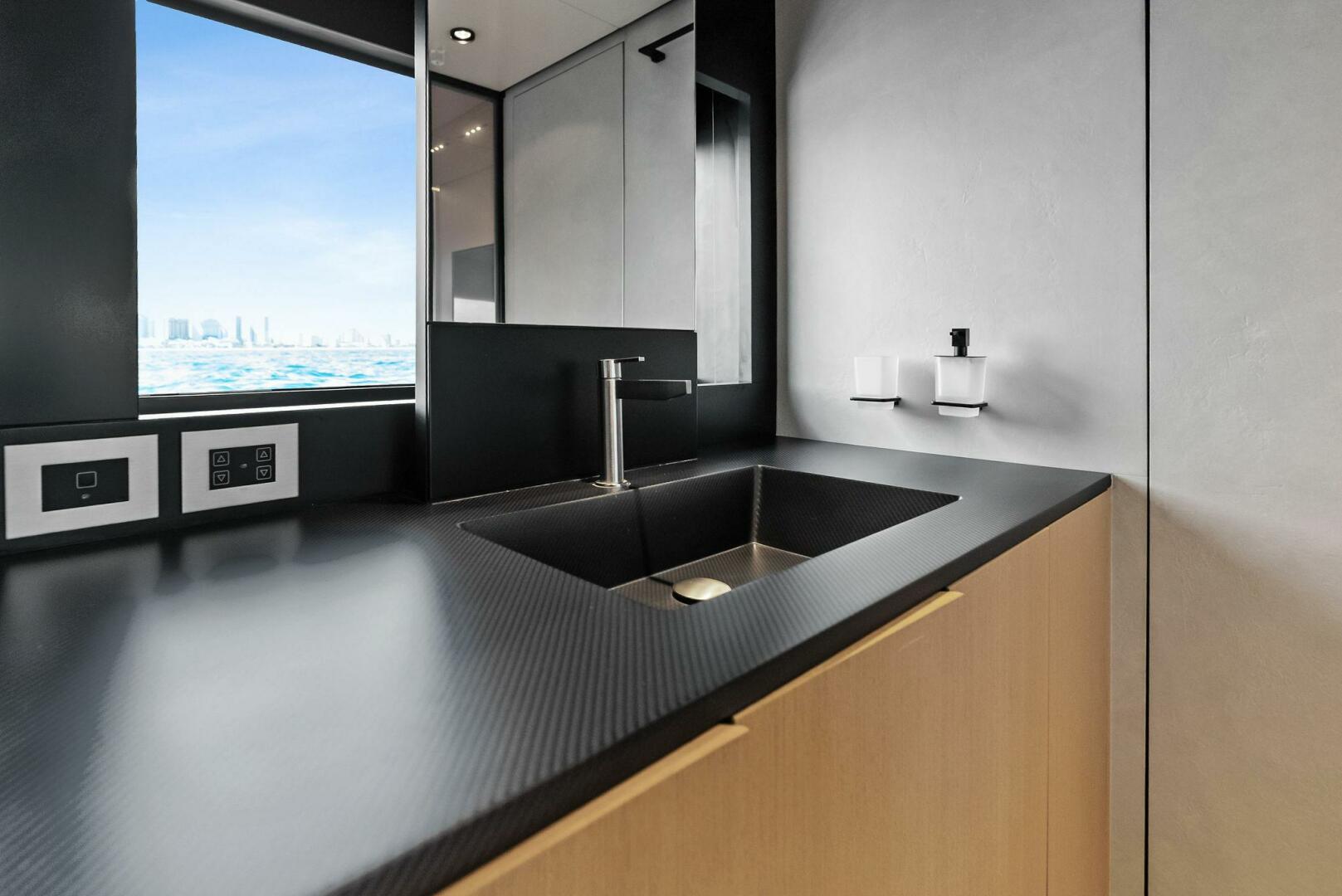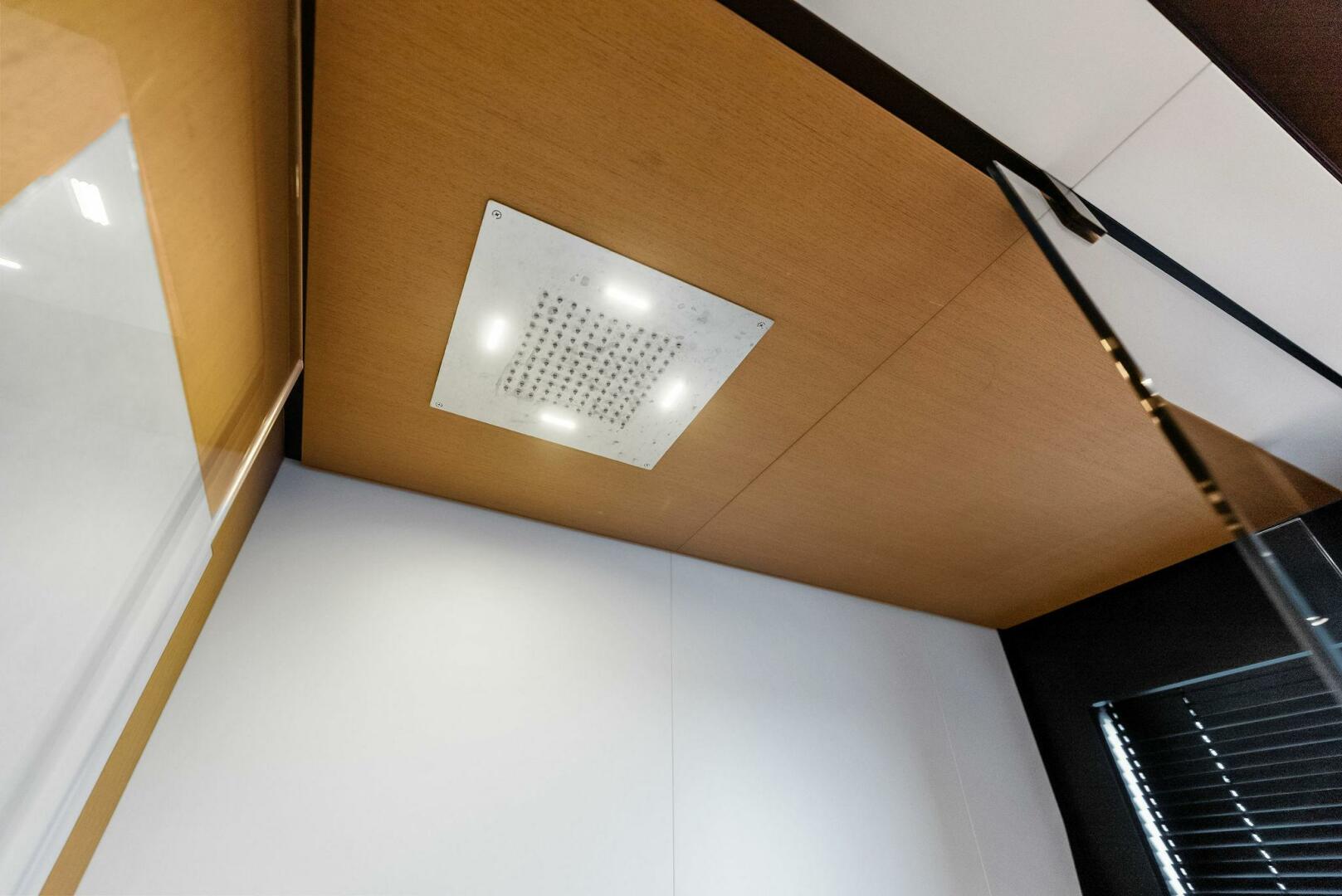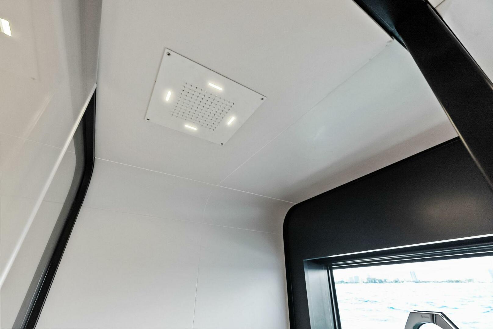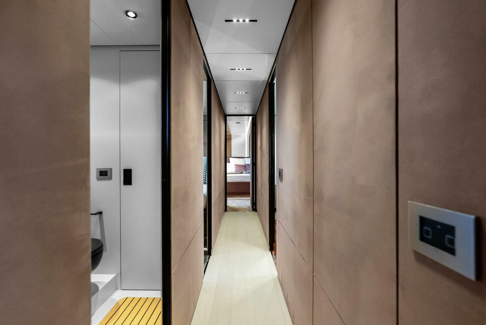 - The lower deck includes a full-beam owner’s suite amidships with an en-suite. featuring electrically switchable smart glass—transparent or opaque at the touch of a button.