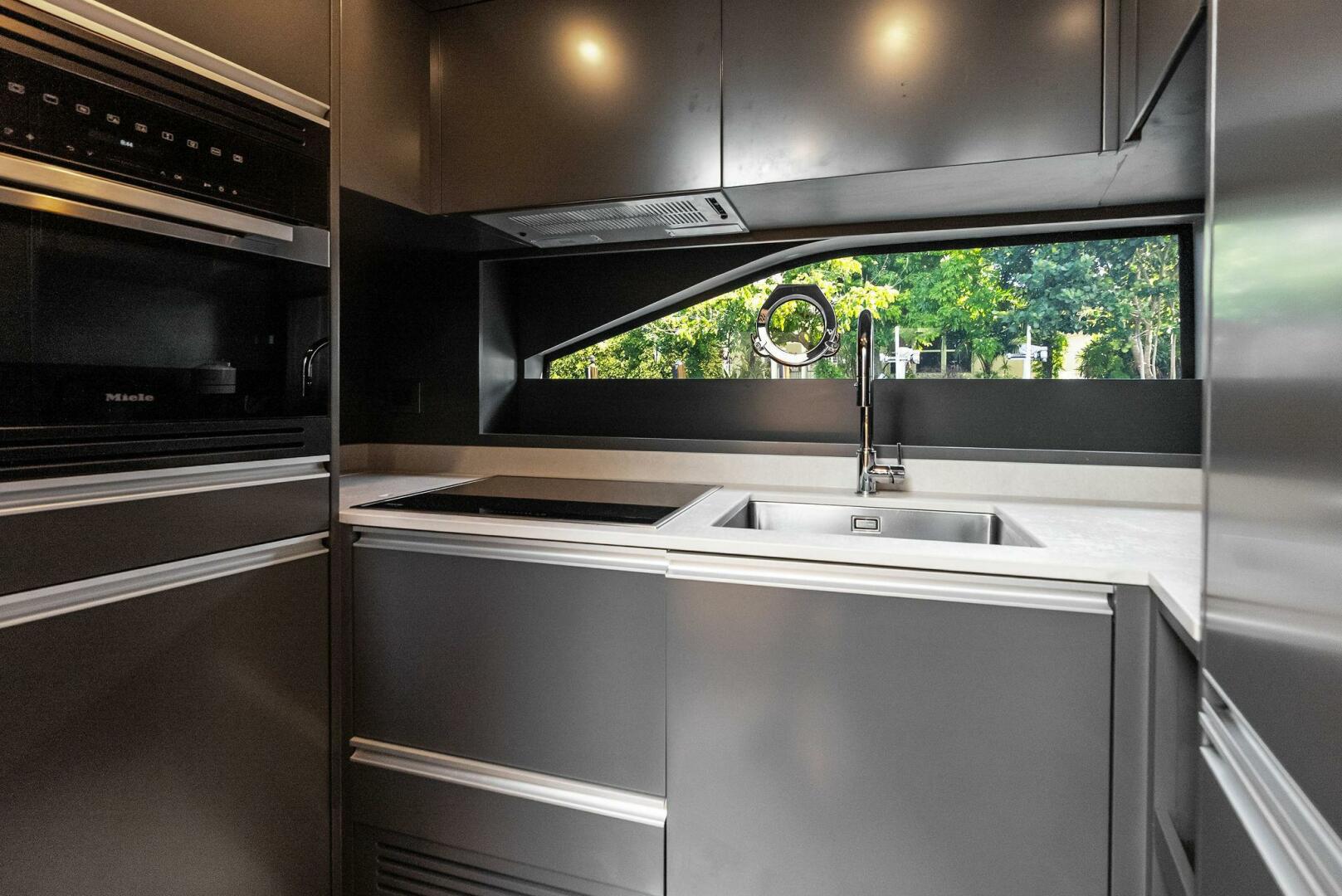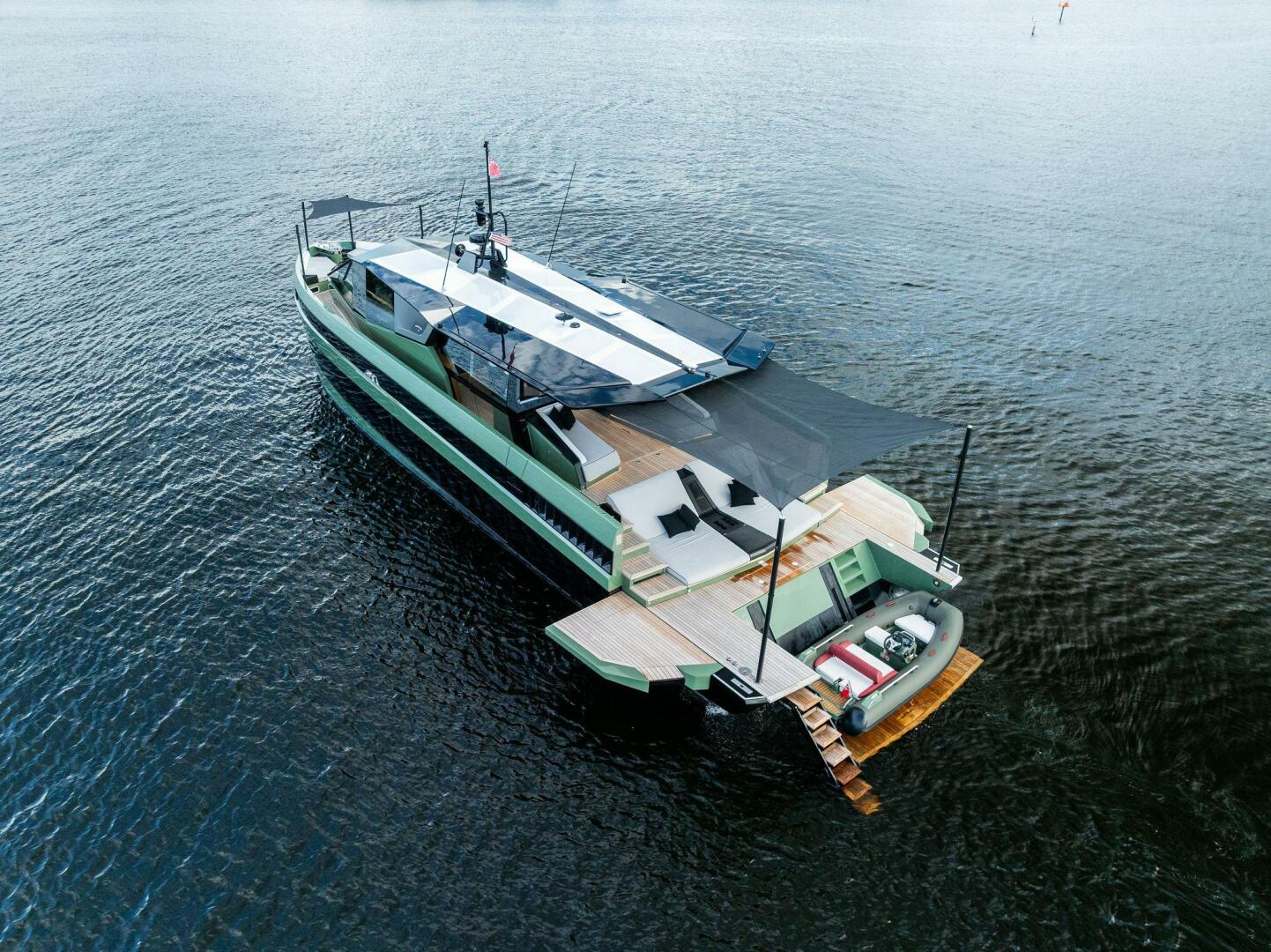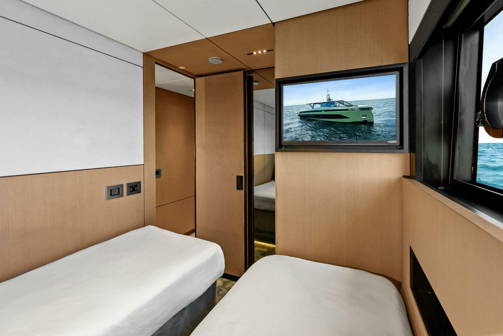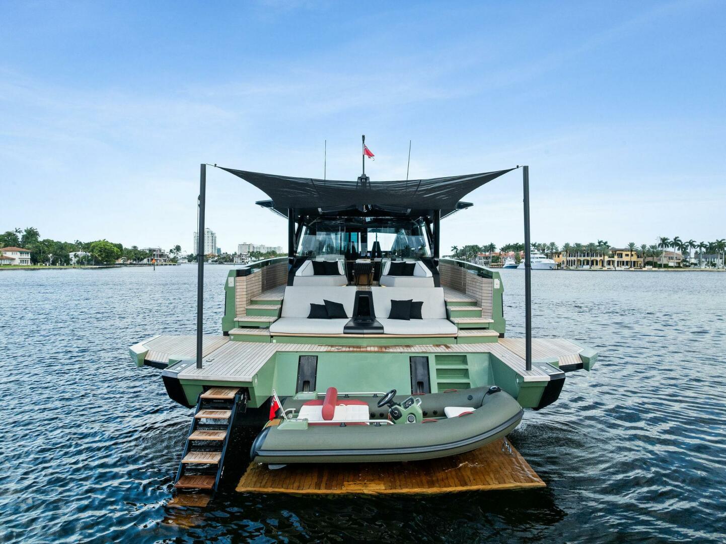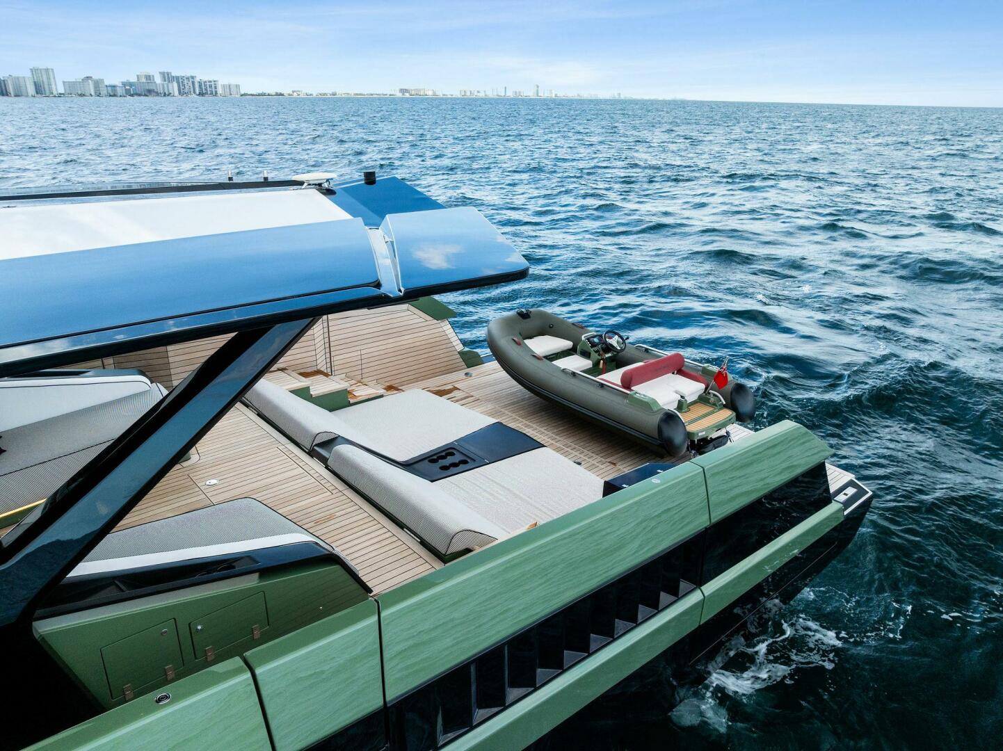 - Built as a crossover yacht, it merges the sleekness of a coupe boat with the volumetric benefits of larger yachts.