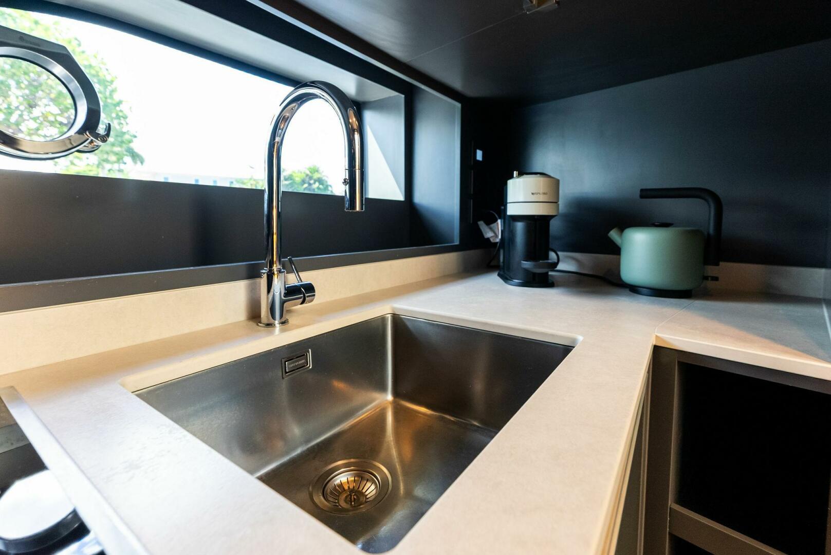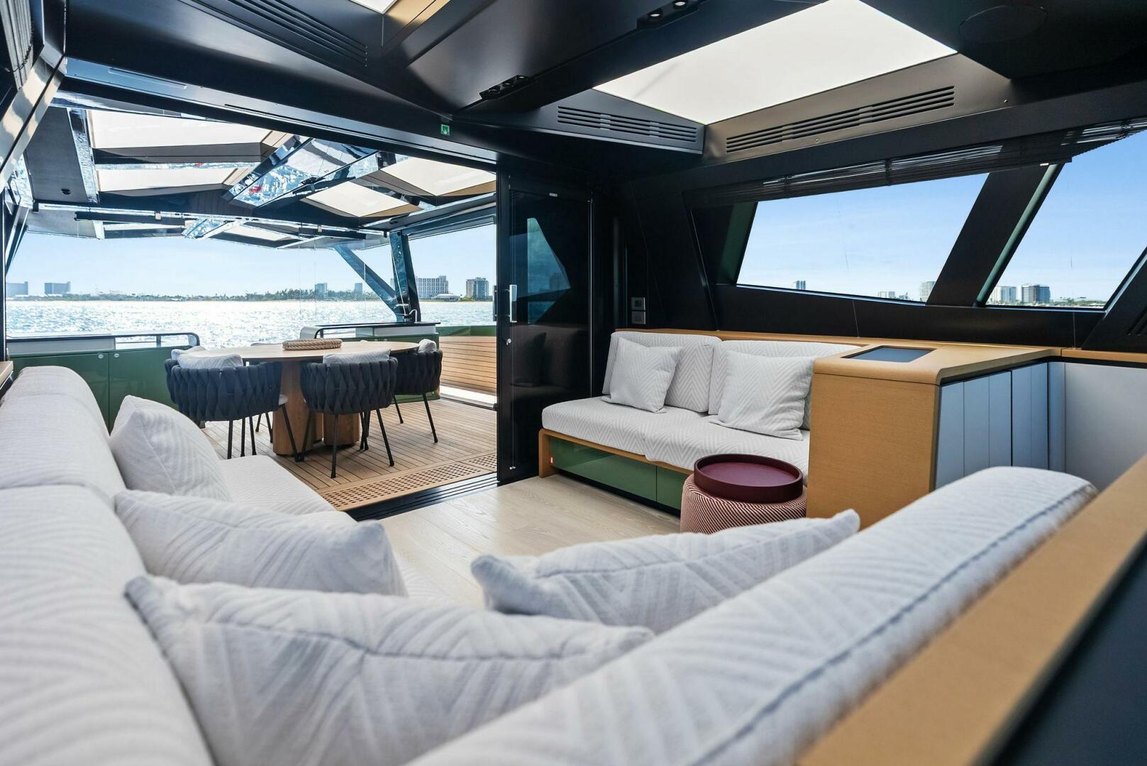 - The main deck blends saloon, dining, and helm spaces in a hybrid inside–outside configuration. Opening sides and aft doors allow you to transform it into an al fresco dining area or cozy movie lounge.