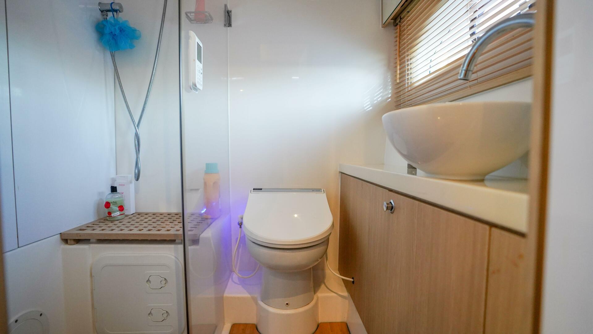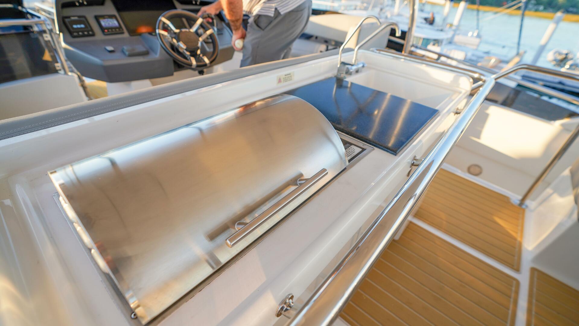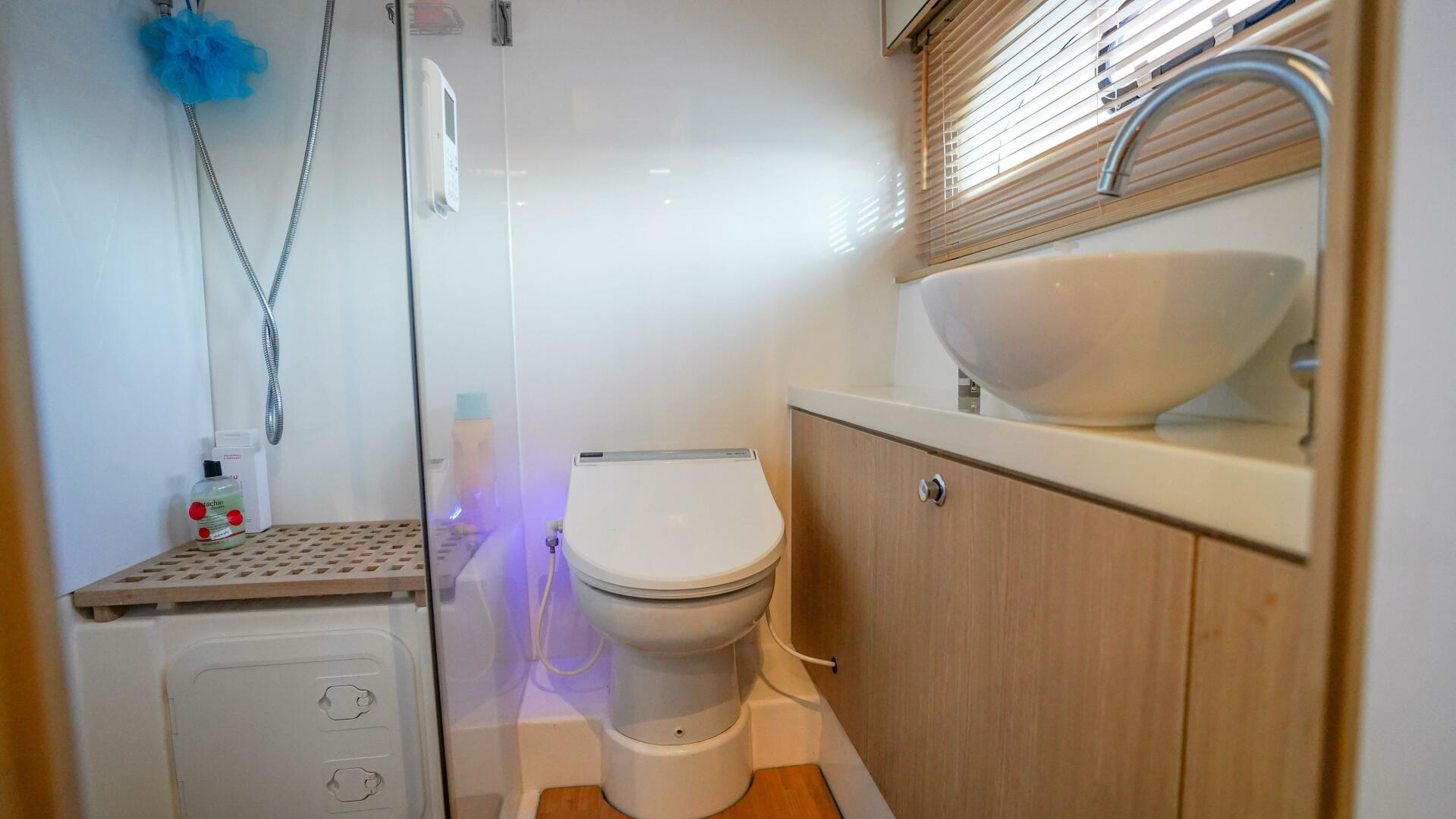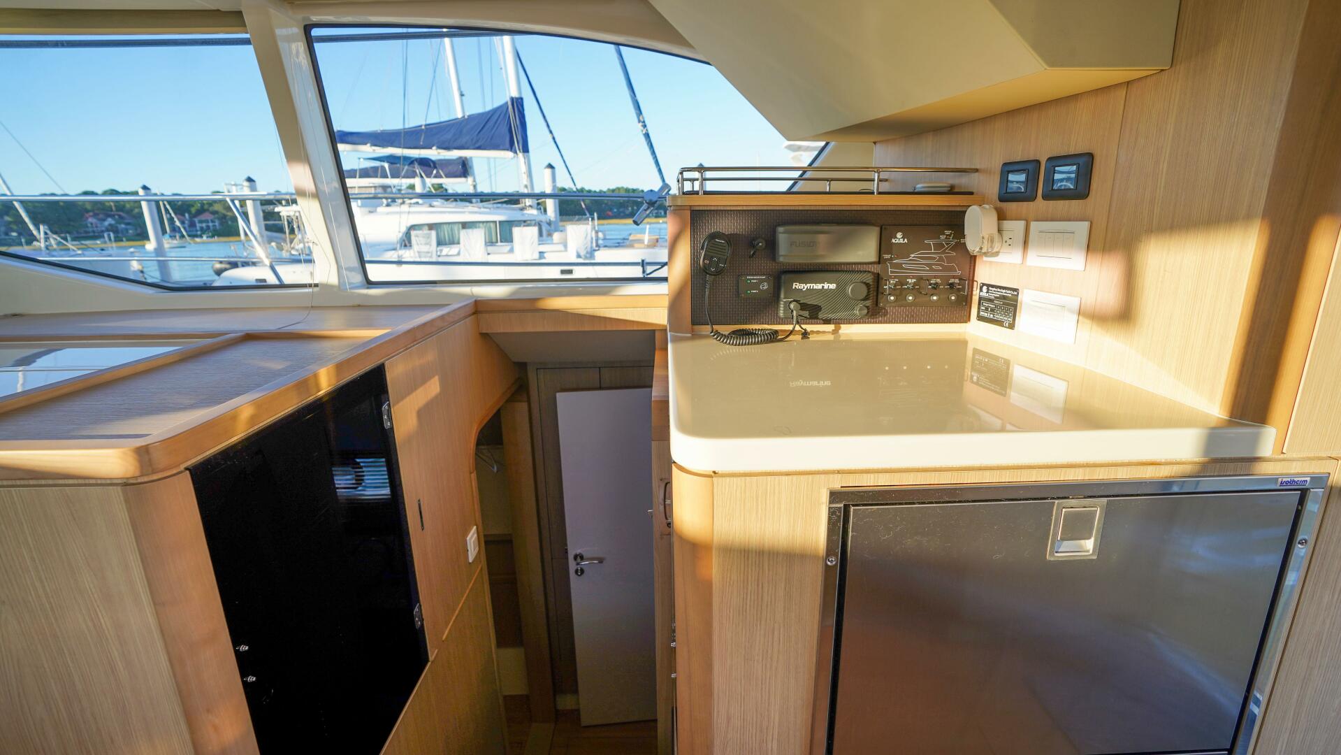 Discover the crowning jewel of the Aquila's galley - a truly exceptional feature. An opening door seamlessly connects the galley to the aft deck, enabling you to mingle with guests while effortlessly preparing drinks and delectable meals. The galley is fully equipped with premium amenities, including.... a Kenyon Two Burner Induction Cooktop, a Convection Oven/Microwave, and an Isotherm 2-drawer Fridge/Freezer. A double-basin stainless steel sink and a dedicated dish drying basin with a drain simplify cleanup, while the Corian countertops exude elegance. Ample storage abounds with thoughtfully designed lockers and cabinets, ensuring your provisions are perfectly stowed. The galley even features a discreet garbage bin, completing this space as a masterpiece of both functionality and style.