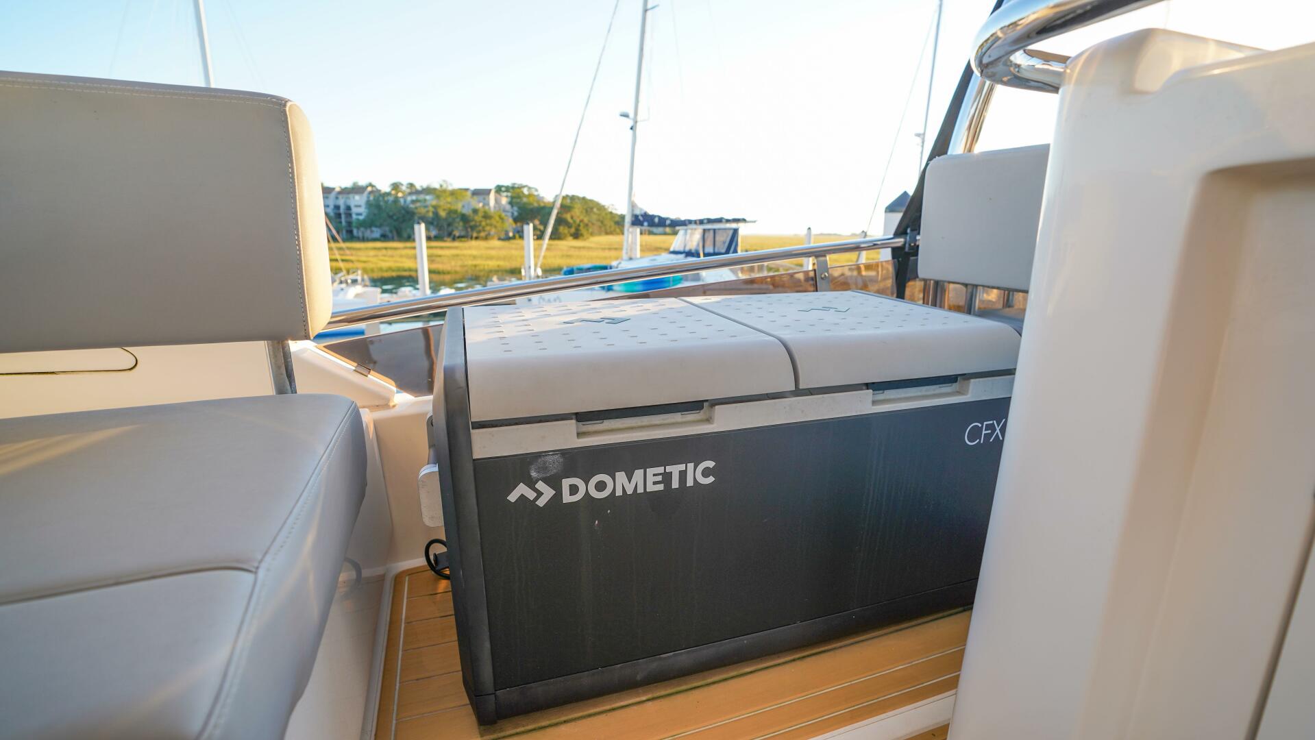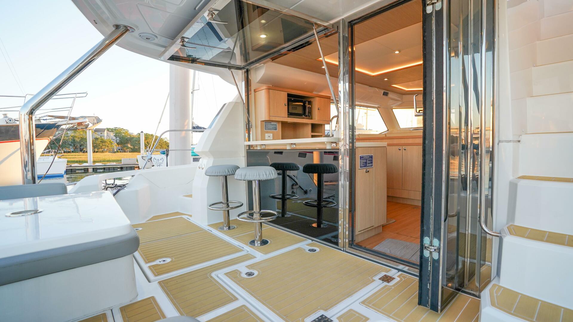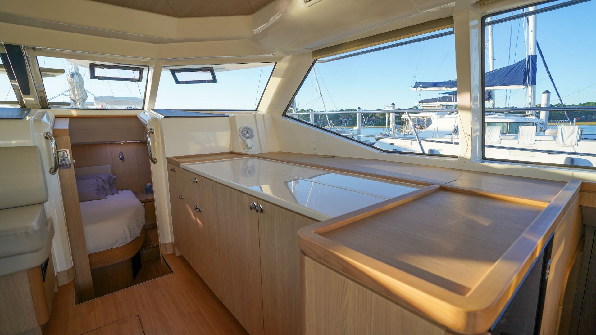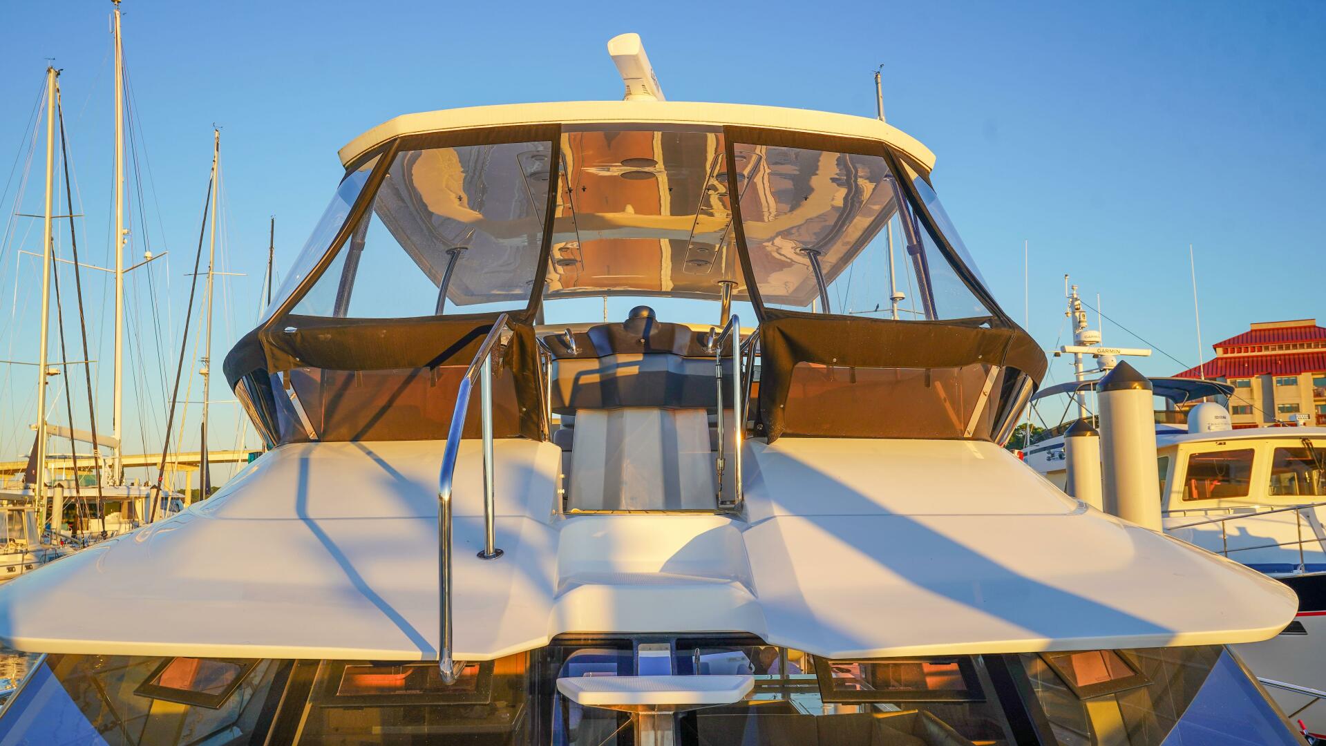 Elevate your yachting experience at the "Final Approach" elevated helm, strategically positioned on the flybridge for an expansive 360-degree view. Crafted for all weather conditions, the helm boasts a removable isinglass windshield, ensuring protection without compromising visibility. Relax in comfort on the spacious helm bench seat, complemented by additional lounge seating. The flybridge invites gatherings with a generously sized table, ideal for dining or savoring sunset cocktails. Unleash your inner mixologist at the full wet bar, complete with a fresh water sink, Kenyon electric grill, ample counter space, Dometic Fridge Cooler, and convenient storage lockers. Access the flybridge effortlessly via the aft stairway or forward bow steps, seamlessly connecting you to panoramic vistas and unforgettable moments.