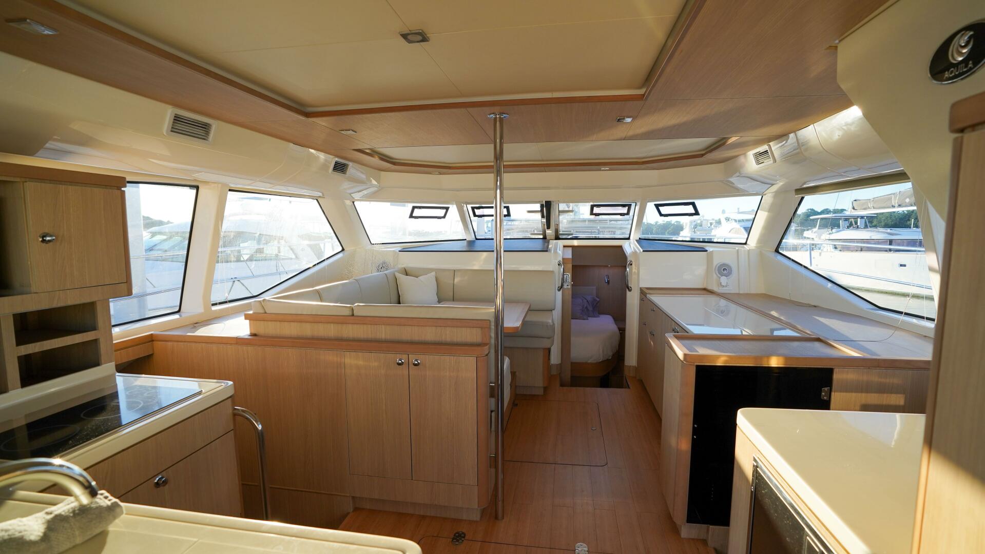 Experience a salon beyond compare aboard this remarkable Aquila. Revel in its panoramic 360-degree vistas, embracing the captivating expanse of the ocean.