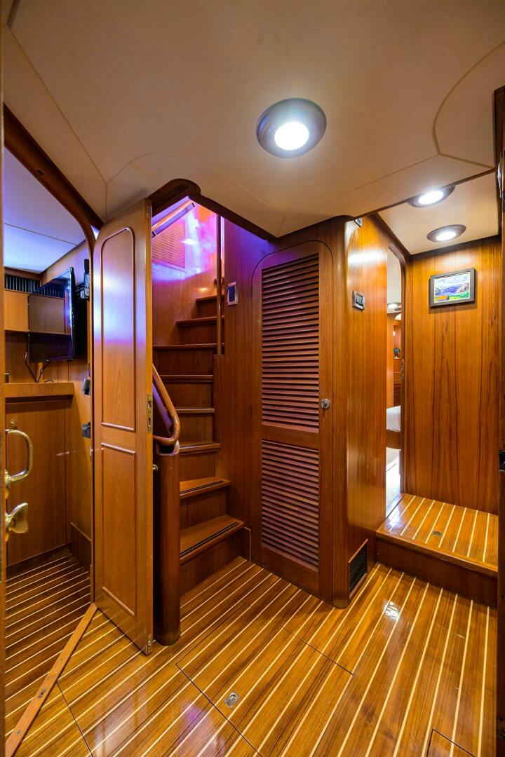 The flybridge was fully refurbished as part of the 2021 refit. At the helm, the expansive flybridge features four comfortable Todd Captain’s chairs, a built-in space for a Yeti cooler, and state-of-the-art navigation electronics mounted on a custom teak helm pod, along with a JL Audio sound system. The bimini top was replaced in 2024. Moving aft, there are four lounge chairs for enjoying time in the sun. Further aft are two built-in seating areas, each with its own custom teak table. Covering the aft section of the flybridge is a large expandable and retractable TUUCI umbrella, bolted directly into the yacht’s aluminum superstructure. Continuing aft is a grill station equipped with a custom butler’s teak table, storage cabinets, and a large freezer for provisions during extended cruising. Adjacent to the grill area is the 20 ft tender storage space, surrounded by ample room for additional toys. The tender is serviced by a 2,000 lb. lift, which was rebuilt in 2021.Aft Deck