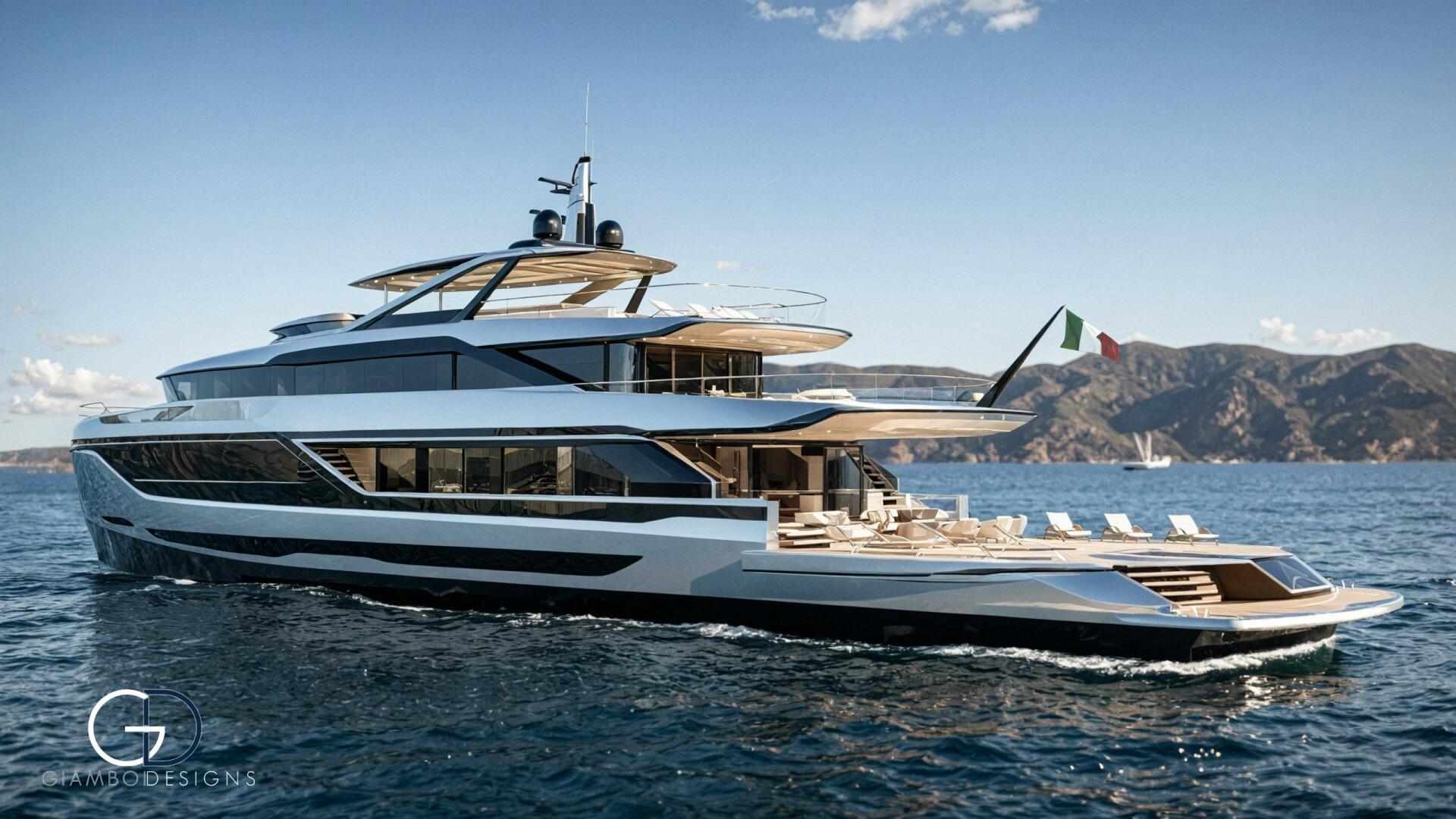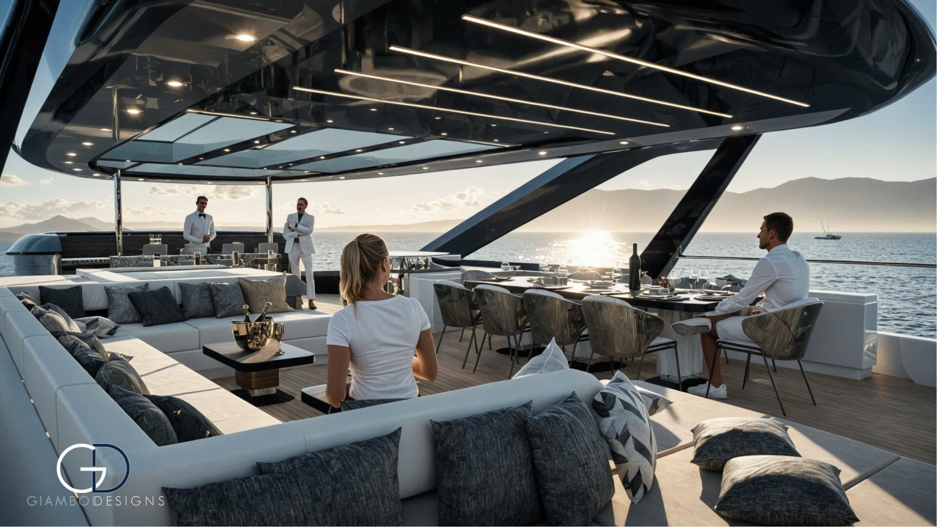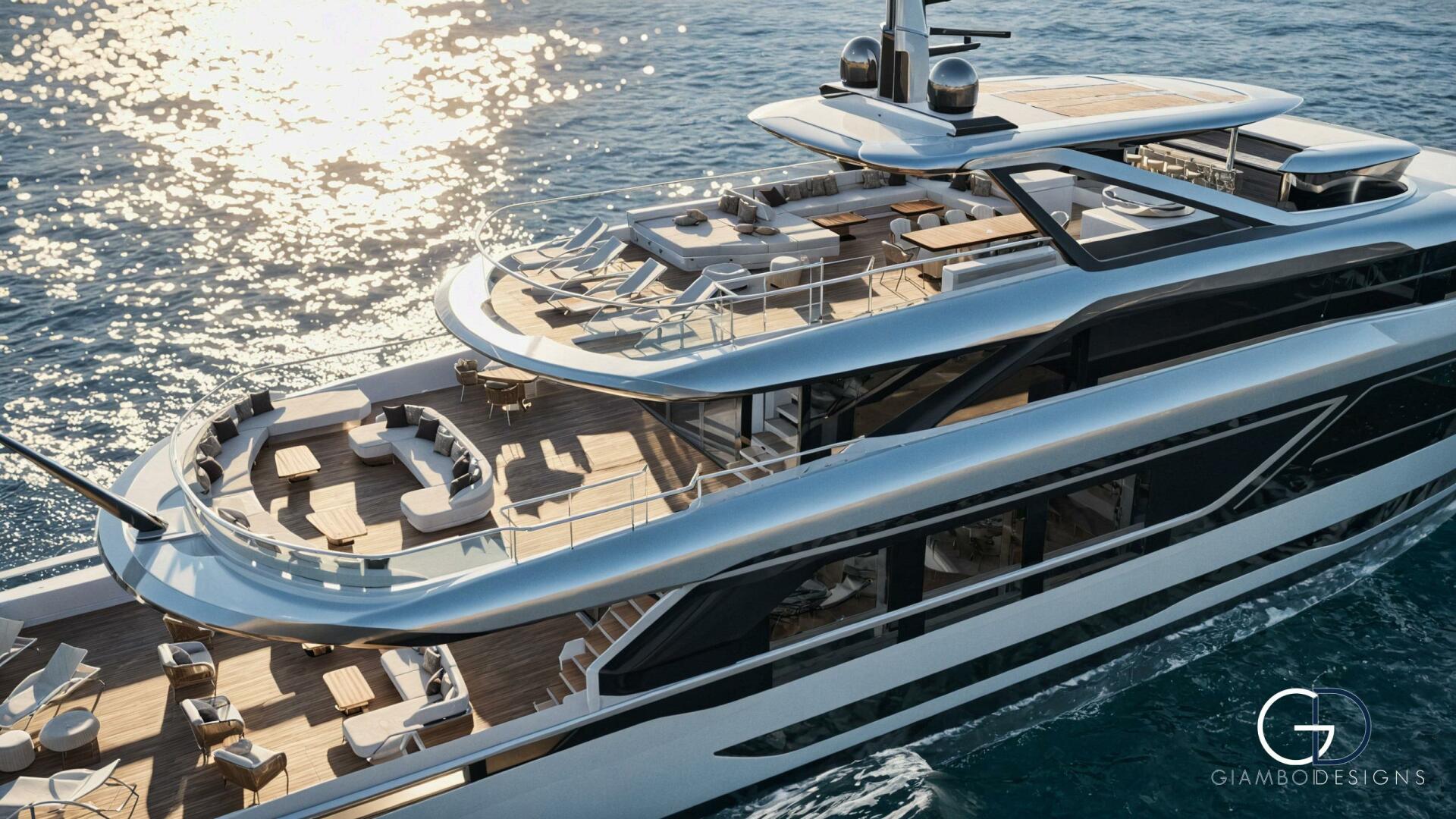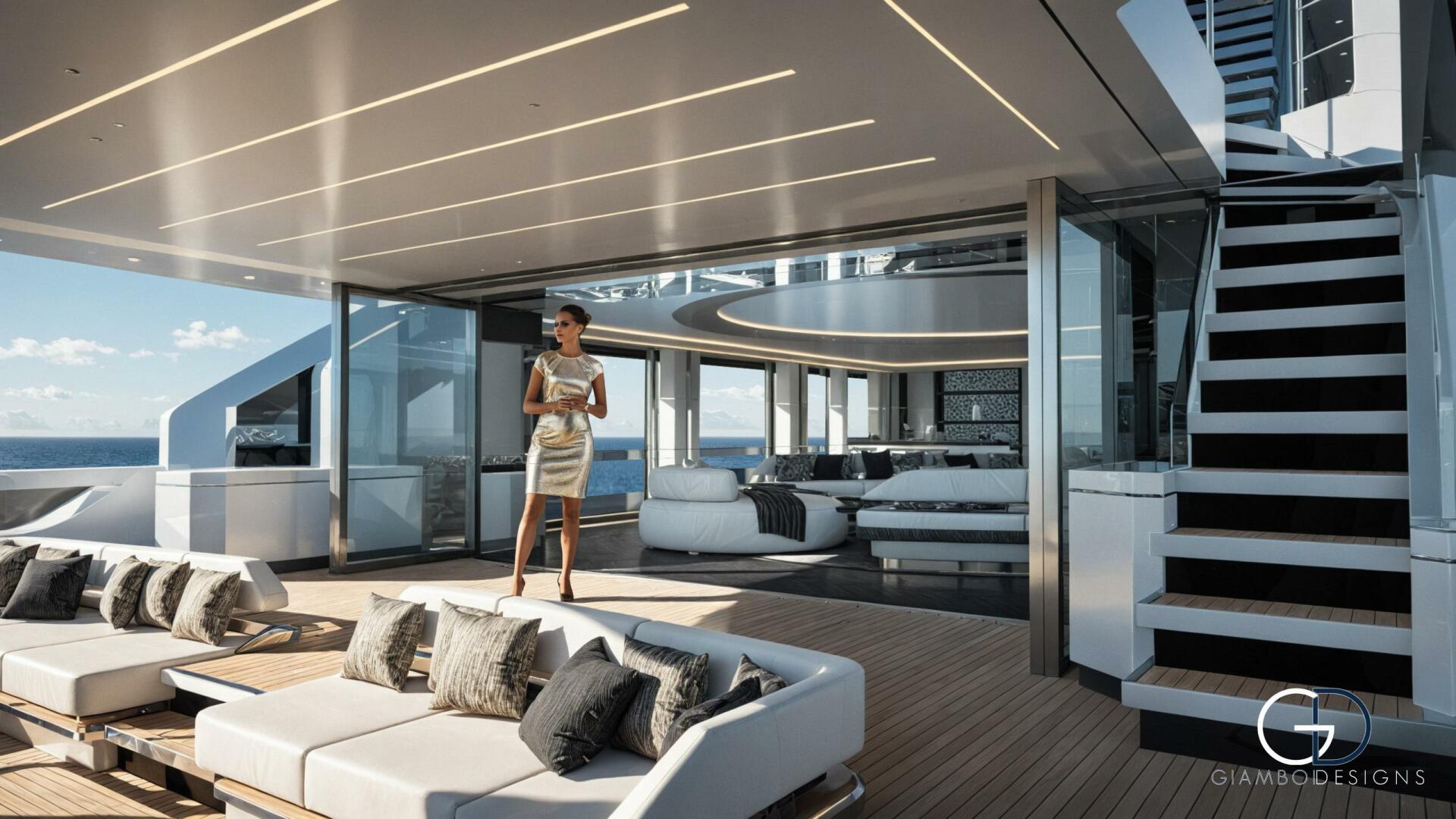Her standout feature is a private master cabin on the forward upper deck with a full-glass facade that opens to a private pool, ensuring privacy while preserving the salon’s space. An asymmetrical main deck boosts interior volume, while fold-down bulwarks create a floating terrace seamlessly connected to the salon.