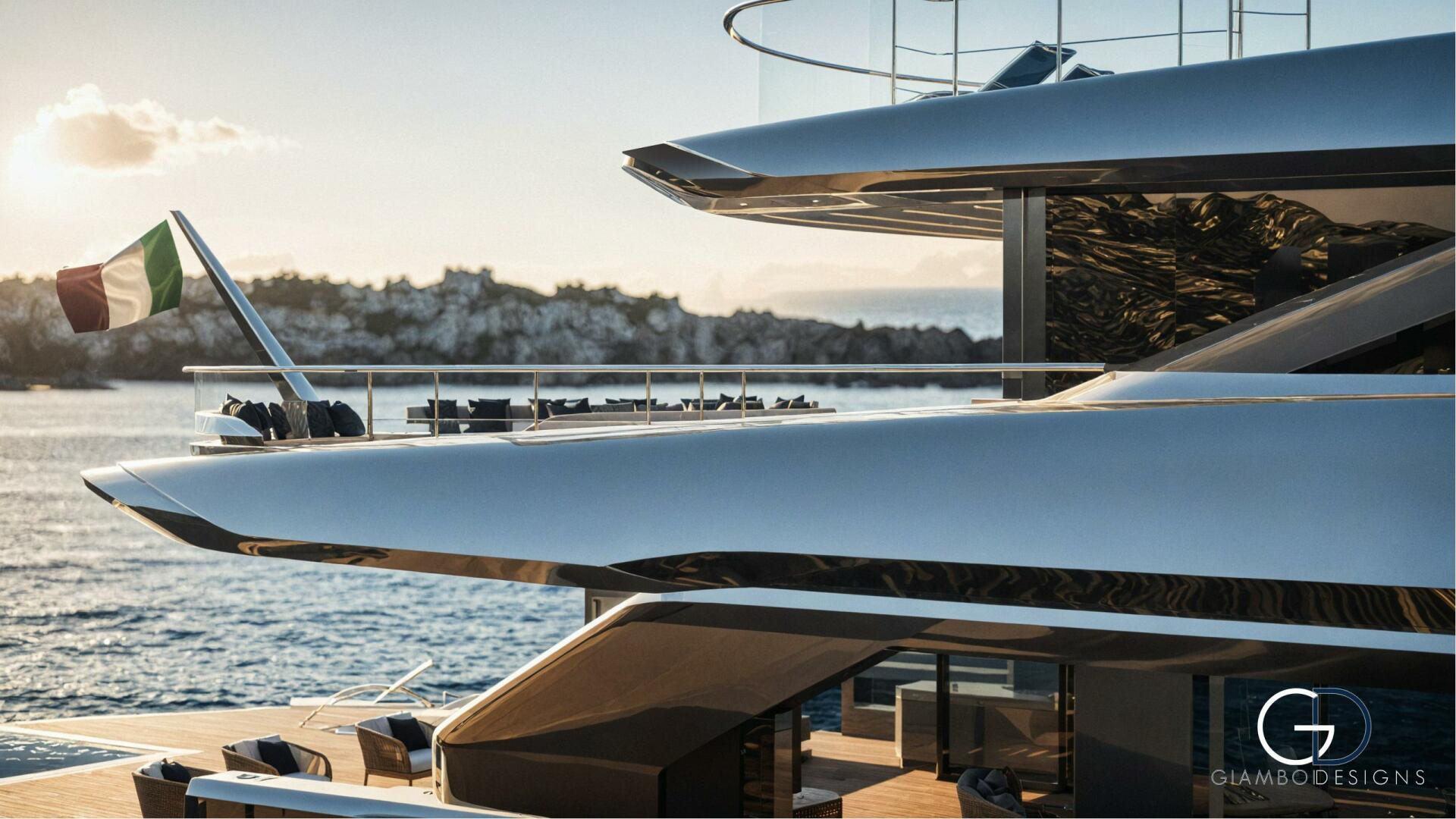 The layout enhances connection with the sea: a spacious main deck aft with fold-down bulwarks transforms into a floating terrace, seamlessly linked to the salon through full-height sliding doors. The master cabin’s forward glass facade also opens completely, providing fresh air, unobstructed views, and direct access to a private pool. An asymmetrical main deck further increases interior volume without compromising exterior spaces or crew circulation.