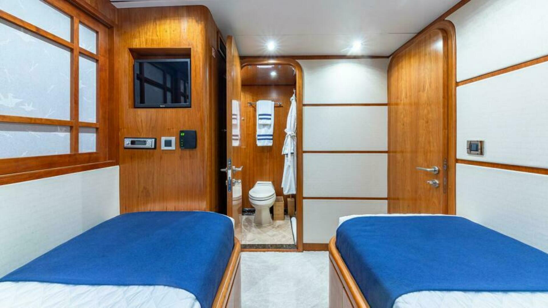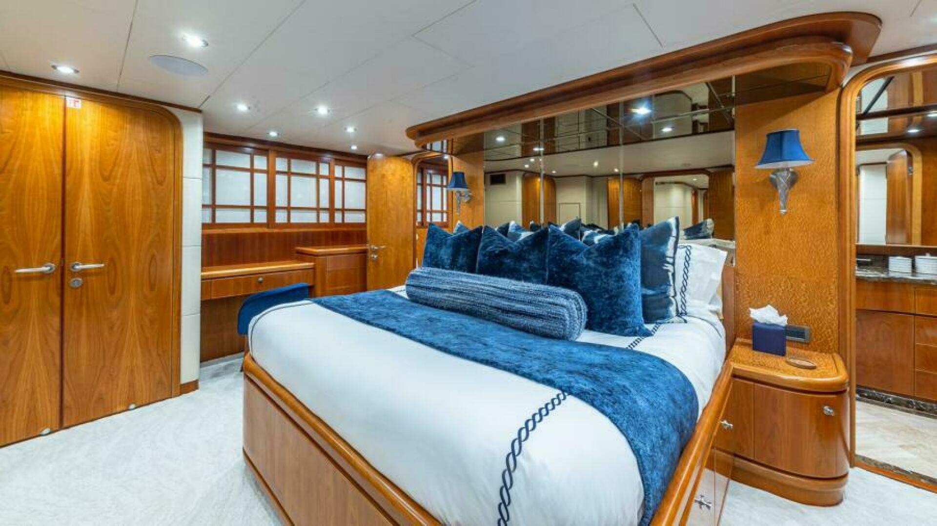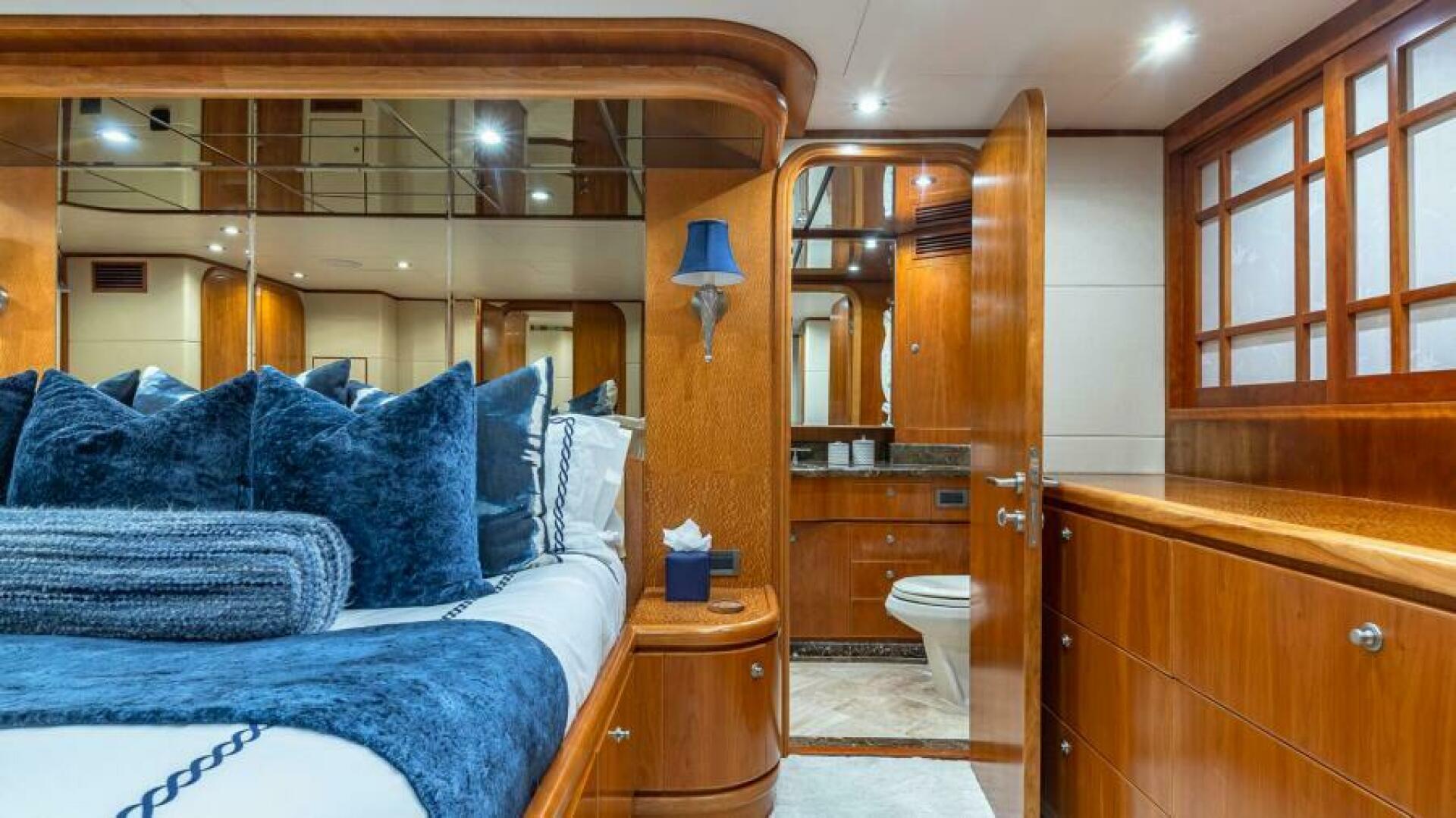 Forward to port is a customized queen berth ensuite cabin. To starboard is a twin berth ensuite. All the way forward is the full beam VIP Suite.