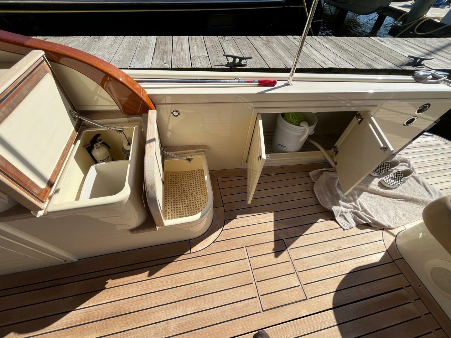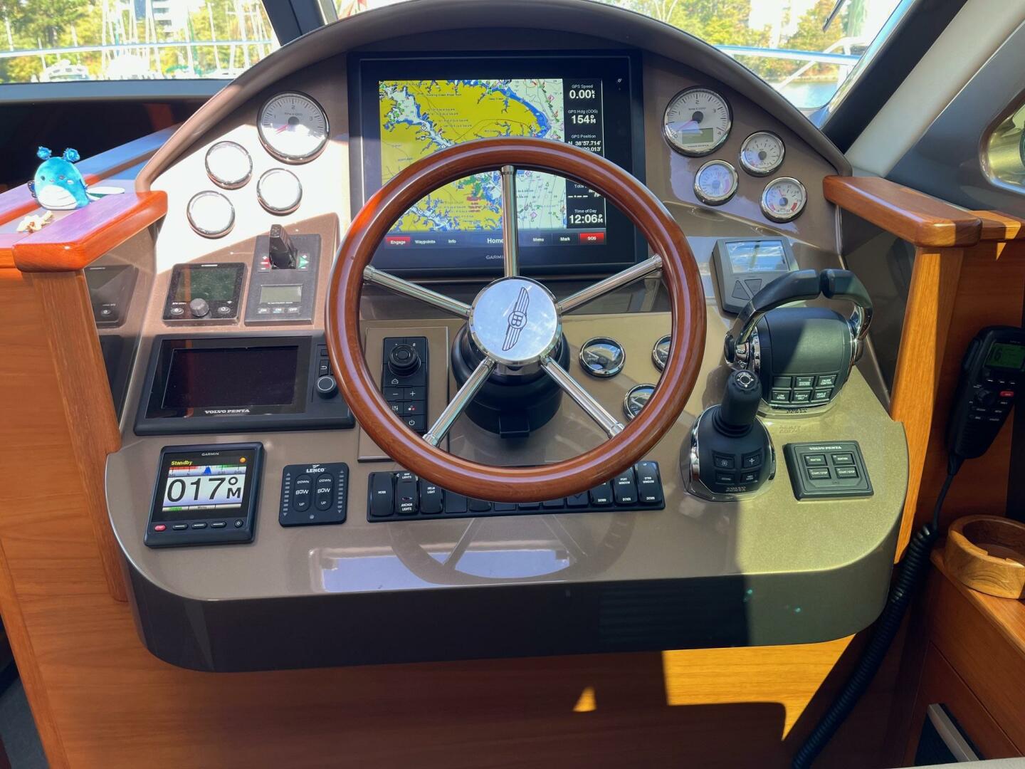 - Ergonomically designed helm station, electronic instrument panel, teak steering wheel and custom helm seating