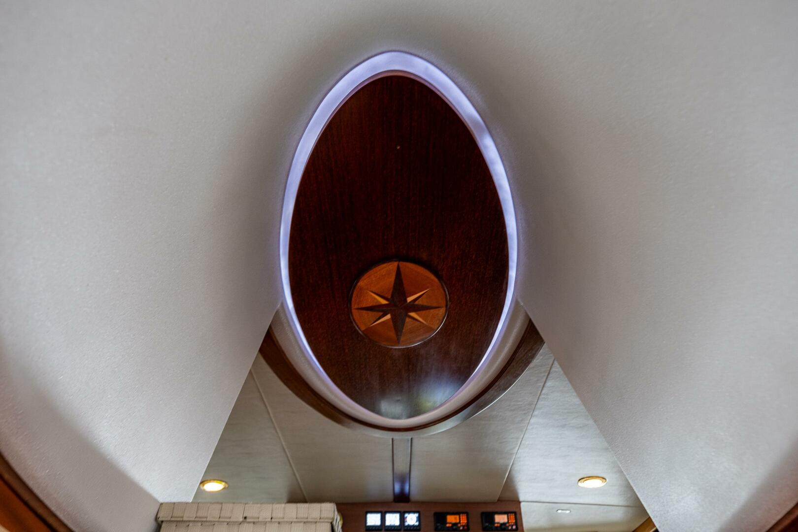Up a few steps to the raised pilothouse. American Tug makes full use of the large "stack", the defining feature of a tug boat, and provides ample headroom above these stairs. A beautiful Jatoba wood insert inlaid with compass rose forms the ceiling inside this stack. The pilothouse is large, open and provides full 360-degree sightlines. The console is full size and houses three Garmin 8600 multi function displays. There are sliding doors on both the port & starboard sides. The port side of the pilothouse has additional seating for 3. On starboard is an additional fridge/freezer and a dedicated hanging locker. A double Bentleys helm chair is on centerline.