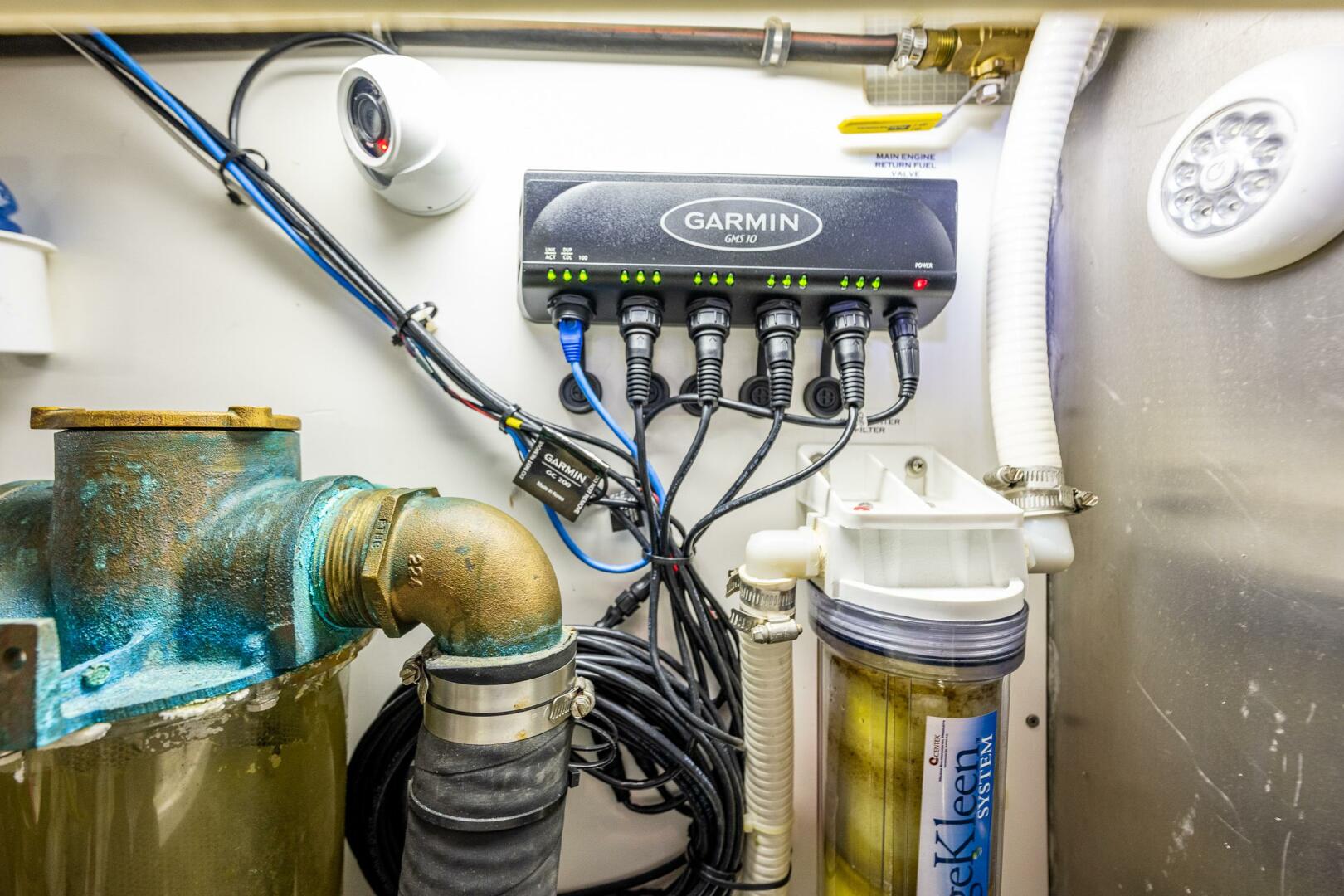 Completing the package are the Garmin 4kw open array radar, FLIR infrared camera and 3 transducers. 9 Additional cameras are mounted on the mast and in the cockpit and connected to the Multi Function Displays. Twin Icom 502 VHF with send and receive AIS via a Garmin transponder. Long range WiFi and Cellular internet are through a Pepwave router but also Starlink was added in 2024. KVH satellite dish brings in Direct TV with subscription.