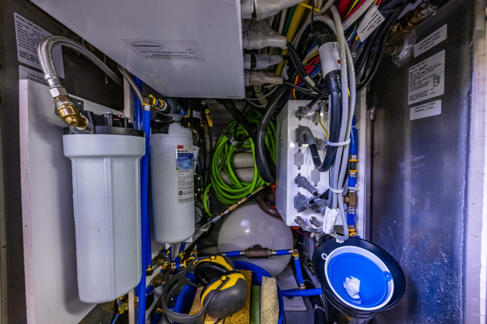 Her shore power system is a 50-amp 240-volt which will enables use of the full size washer & dryer when connected to shore power or while running the Onan 9-kw genset. Glendenning power retractor for the cord is installed.