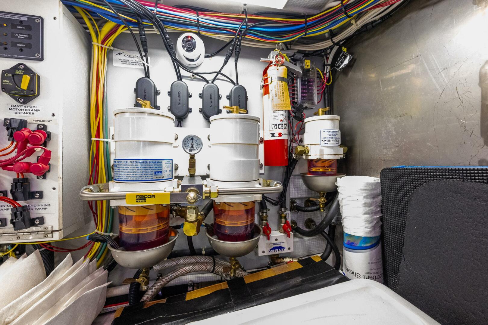 Big Red's Twin Disc marine gear is fitted with electronically controlled Troll Valve for fishing. She has a second station in the cockpit with engine controls which allows fine tuning of the speed while tending the rods.