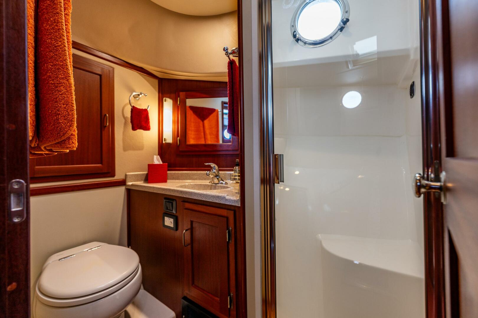 Forward is the guest stateroom with a queen pull man berth and an additional upper bunk which is perfect for the extra fisherman or your guests duffel bags. The guest stateroom has a private head with full shower.