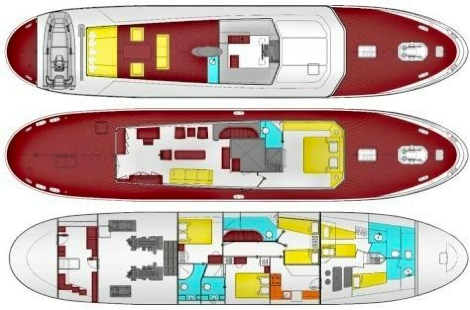 On the lower deck there are two double bedded guest cabins, one cabin with two single beds, the galley and the crew quarters in the bow area including a crew mess. All cabins have their ensuite head.