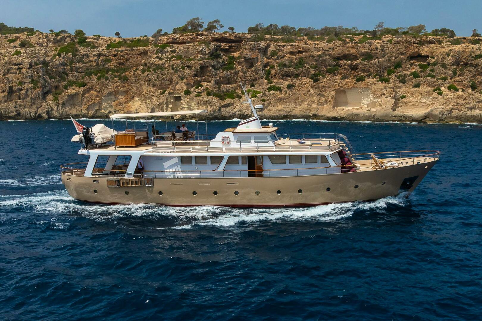 Black Pepper (ex Koheilan) is a true “gentleman’s motor yacht” with timeless and elegant lines built in 1975 by Cantieri di Lavagna, Italy. She features a solid steel round bilged hull with a draft of approx. 2.4m/8’ and is powered by twin MAN heavy duty diesel engines of 560 hp each (new installed 2026), reaching a comfortable cruising speed of approx. 9 knots with a 1.500 nm range.