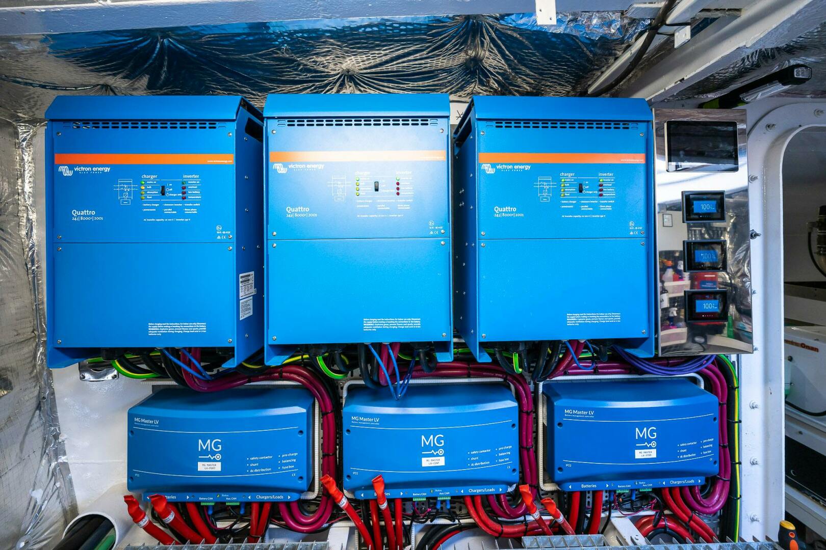- Complete replacement of the electrical system including new battery banks, 3x new battery charger-inverters and a new galvanic isolator.