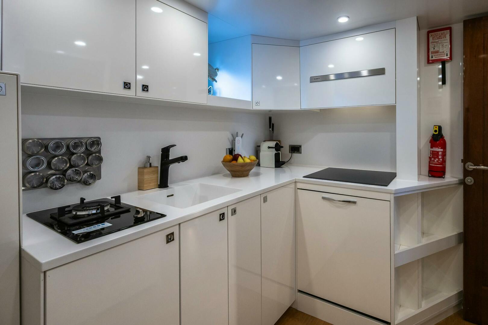 The fully equipped galley with all new equipment is situated to starboard side with plenty of workspace and, moving forward, there is access to the crew mess and crew quarters.