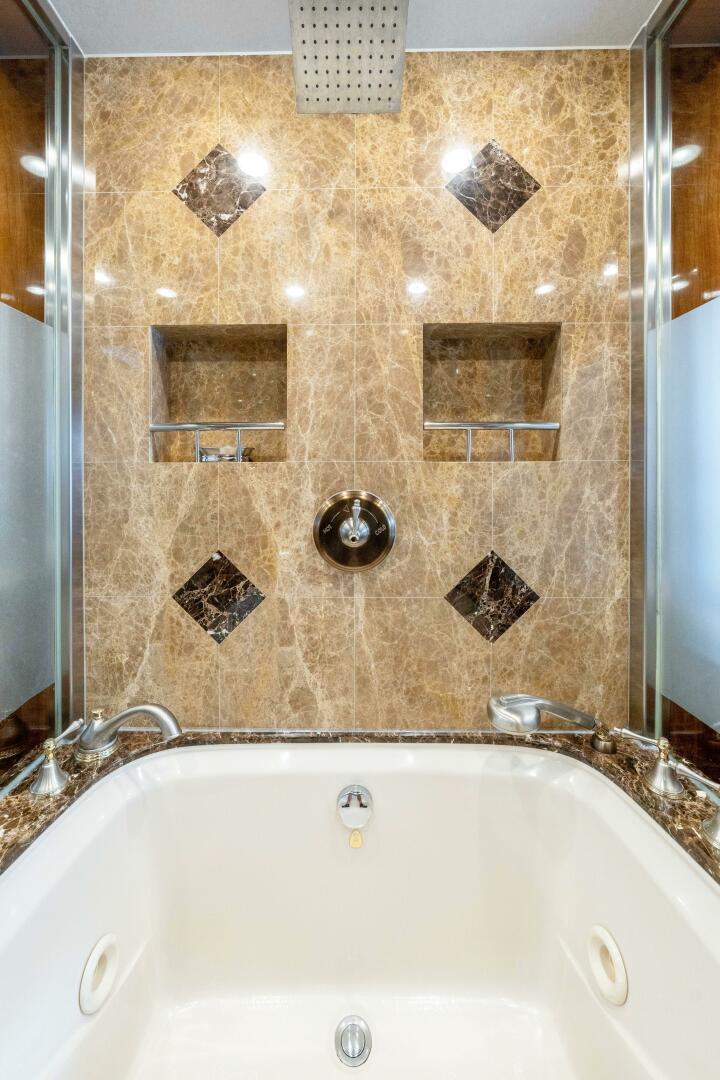 - Master Suite: Full-beam king berth, his/hers ensuite bathrooms with jetted tub