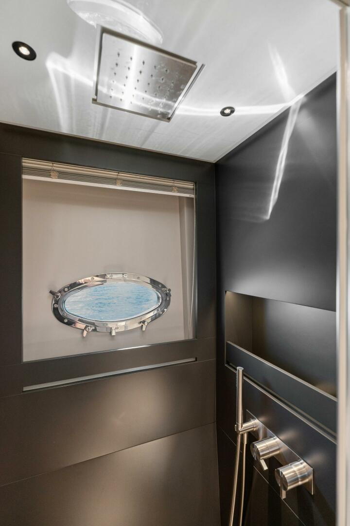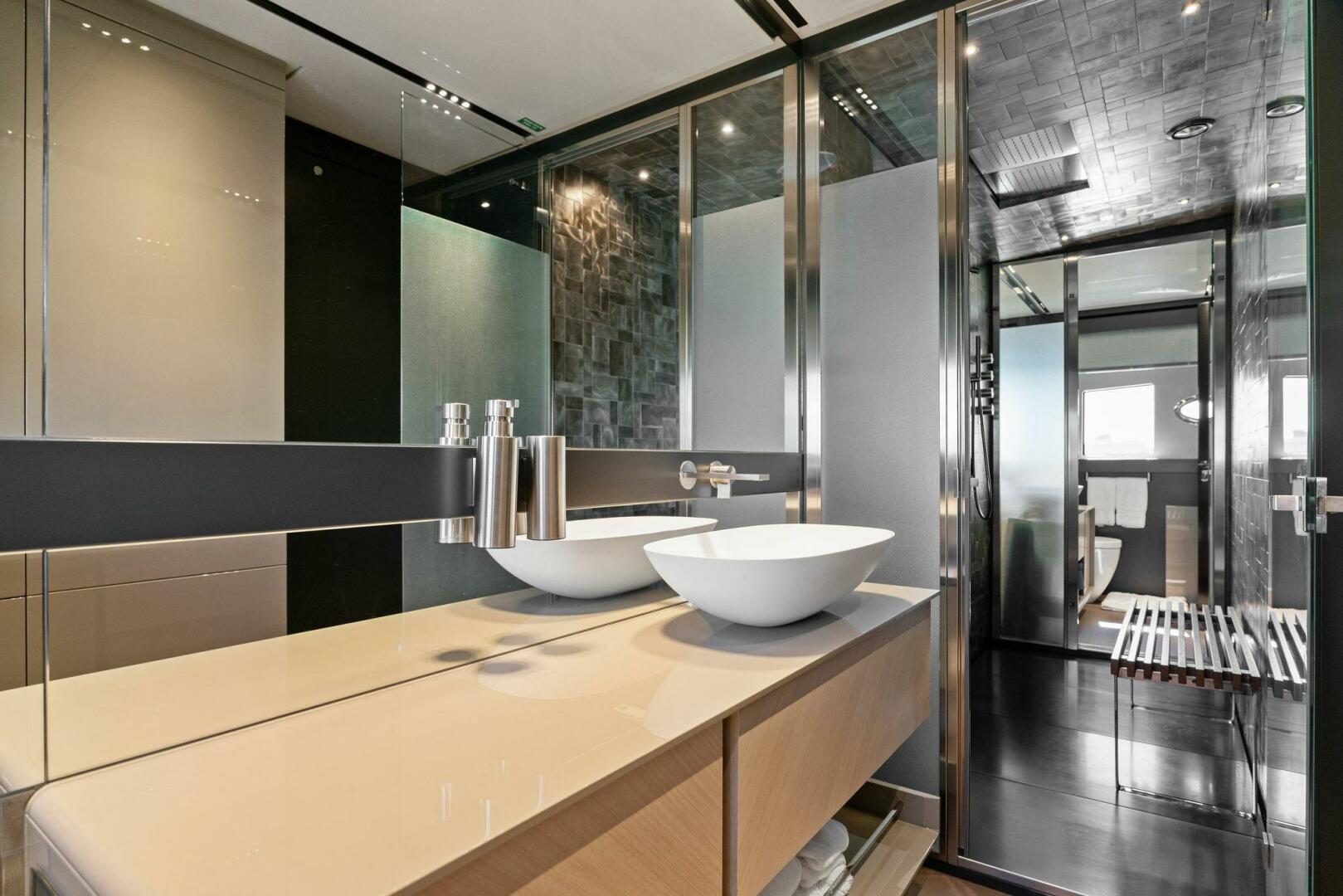With her sporty nature and extreme livability, her elegant styling and razor sharp focus on making life pleasurable, CAFFEINE elevates the seagoing experience to a new dimension. Built with Bahamas and Miami boating in mind for a knowledgeable, repeat yachtsman, CAFFEINE embodies a 5-cabin, 7-head, speedy, Americanized under 5’ shallow draft yacht boasting a bar, jacuzzi and sport flybridge with hardtop.