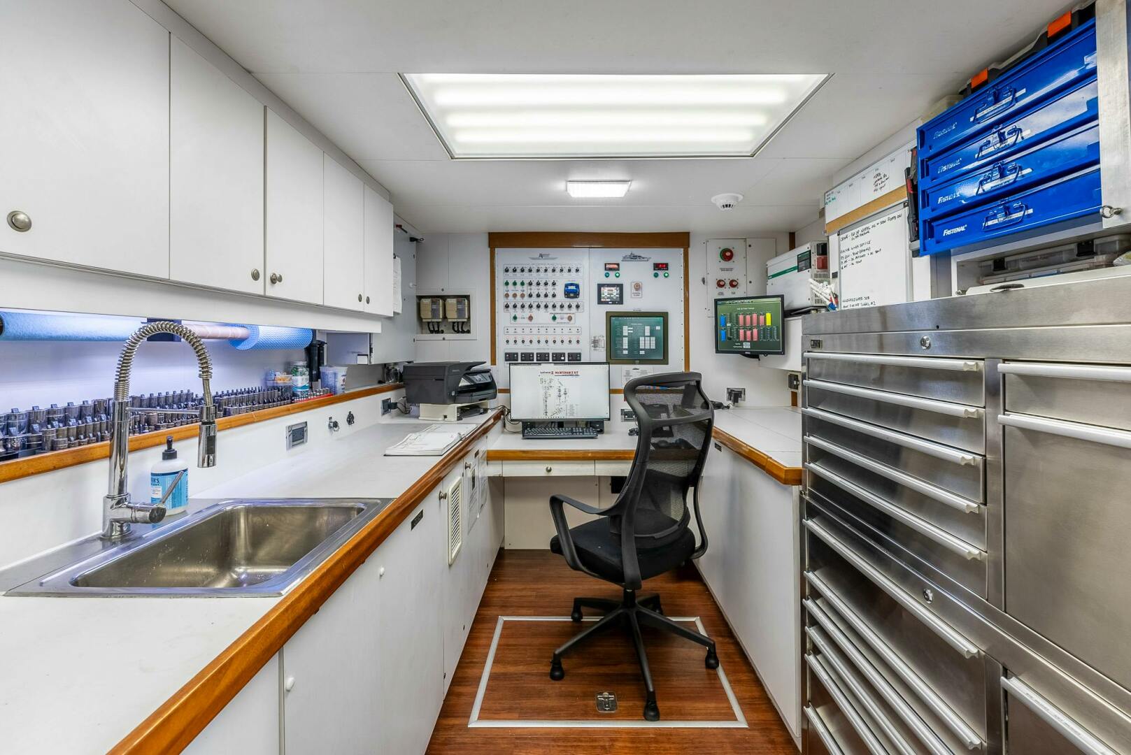 Her bridge deck stateroom, presently used as the Captain’s cabin, was originally designed as a guest suite for an owner that wanted to run the yacht as an owner/operator and who wanted to be close to the bridge. In that case, as it was under one of her previous owners, the Captain relocates to the starboard side aft crew stateroom.